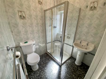 SHOWER ROOM Corner shower cubicle, low level W.C., pedestal hand wash basin, Radiator, Upvc double glazed window, radiator.