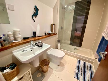 An attractive part tiled ensuite comprising, walk in shower, low level wc, hand wash basin, ladder radiator, inset ceiling spotlights.