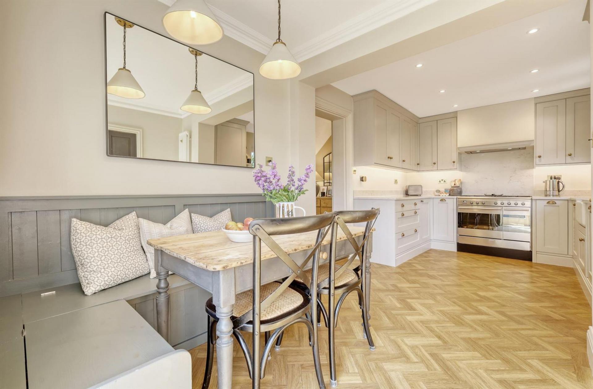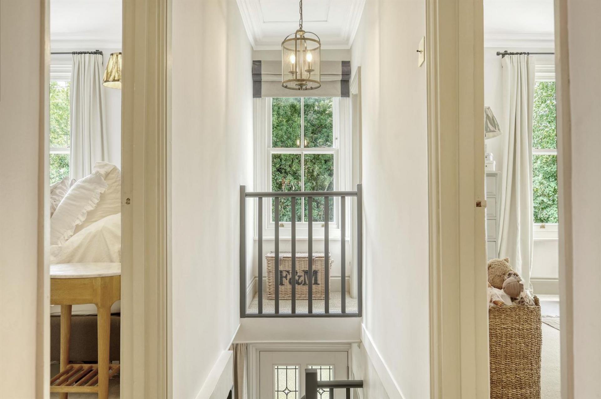 Upstairs, there are three generously sized double bedrooms, each featuring wool carpets, and a beautifully refitted four-piece Burlington bathroom suite. High-end touches such as Jim Lawrence and Pooky lighting, cast iron radiators, and bespoke shutters enhance the character throughout, while double-glazed sash windows and doors by Timber Windows ensure comfort and efficiency.