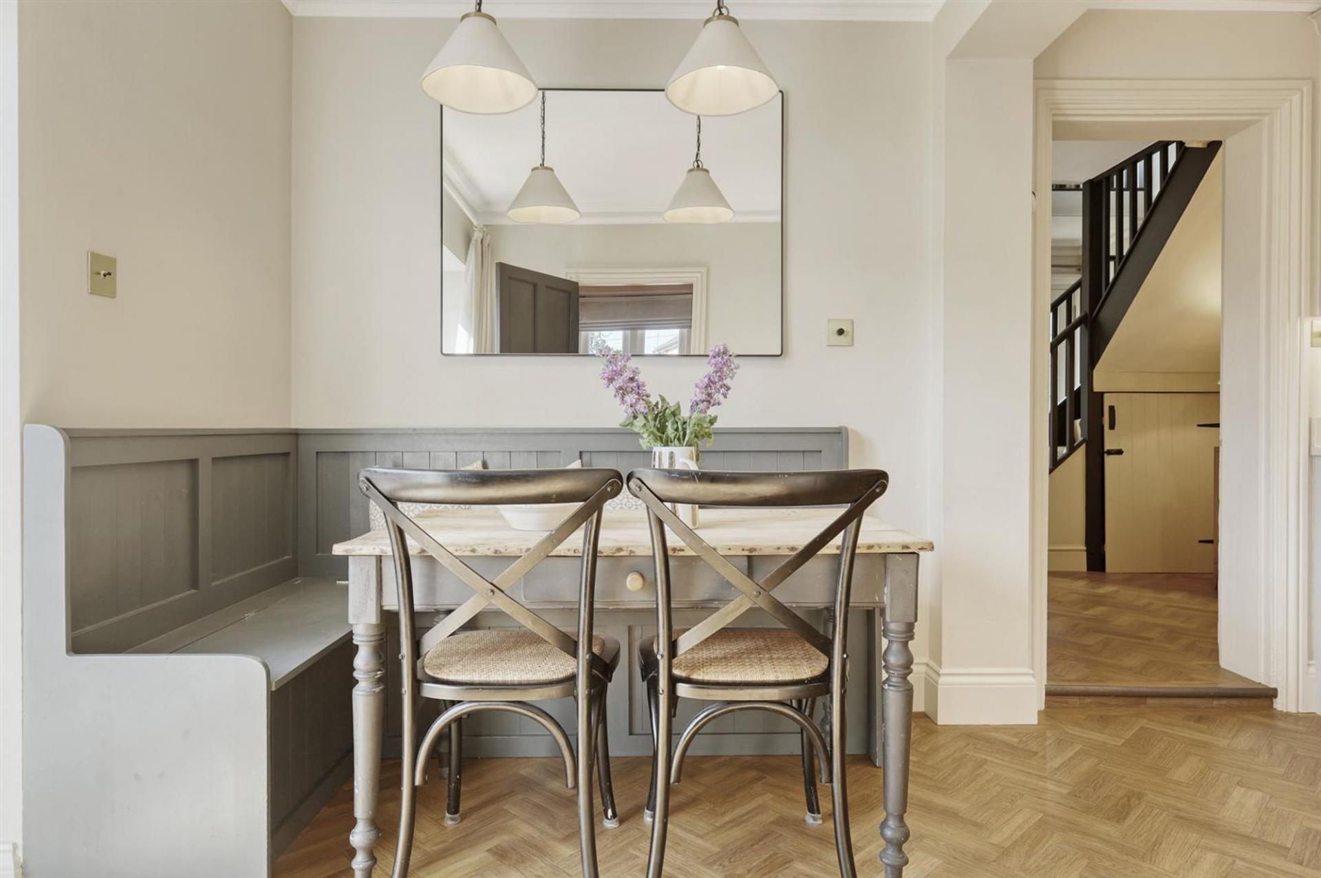 The ground floor comprises a welcoming sitting room with a feature fireplace, a second reception room complete with a widescreen log burner, and a bespoke kitchen fitted with Neff integrated appliances, quartz work surfaces, and built-in banquette seating offering both comfort and practical storage. The space is complemented by a stylish ground floor cloakroom finished with Burlington fittings.