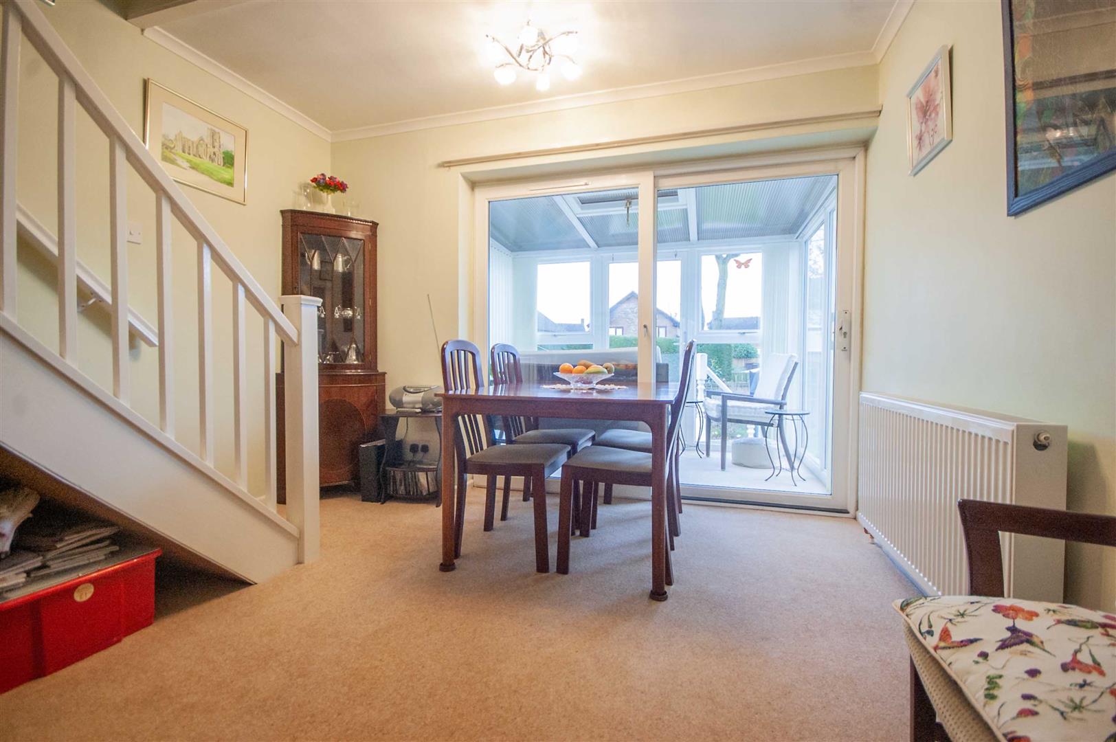 Dining Room: - 3.33m x 3.20m (10'11" x 10'6") - Double glazed sliding door to conservatory, stairs to first floor, radiator.