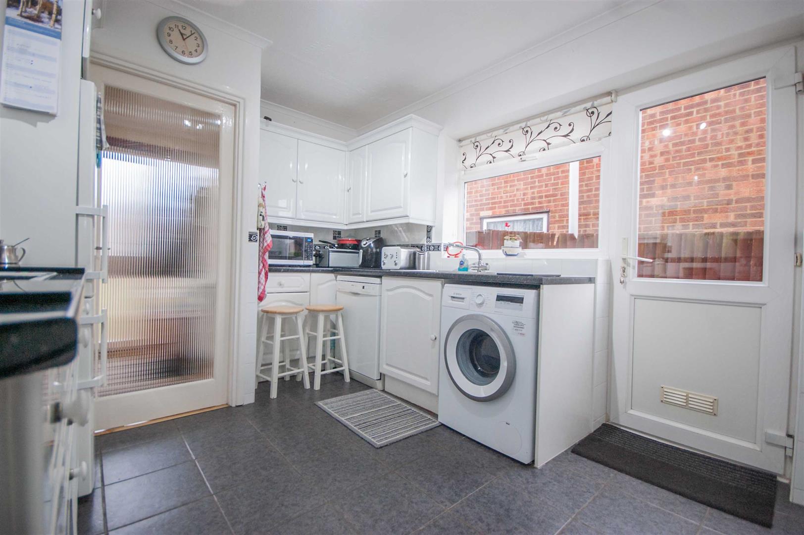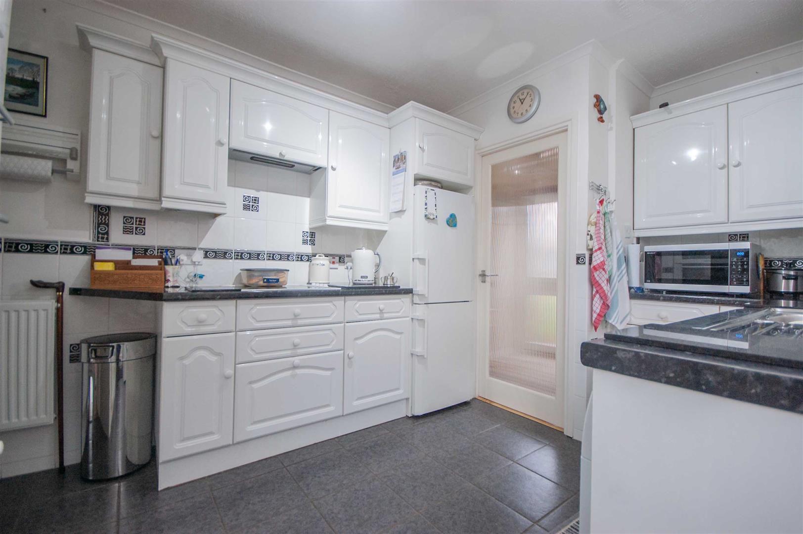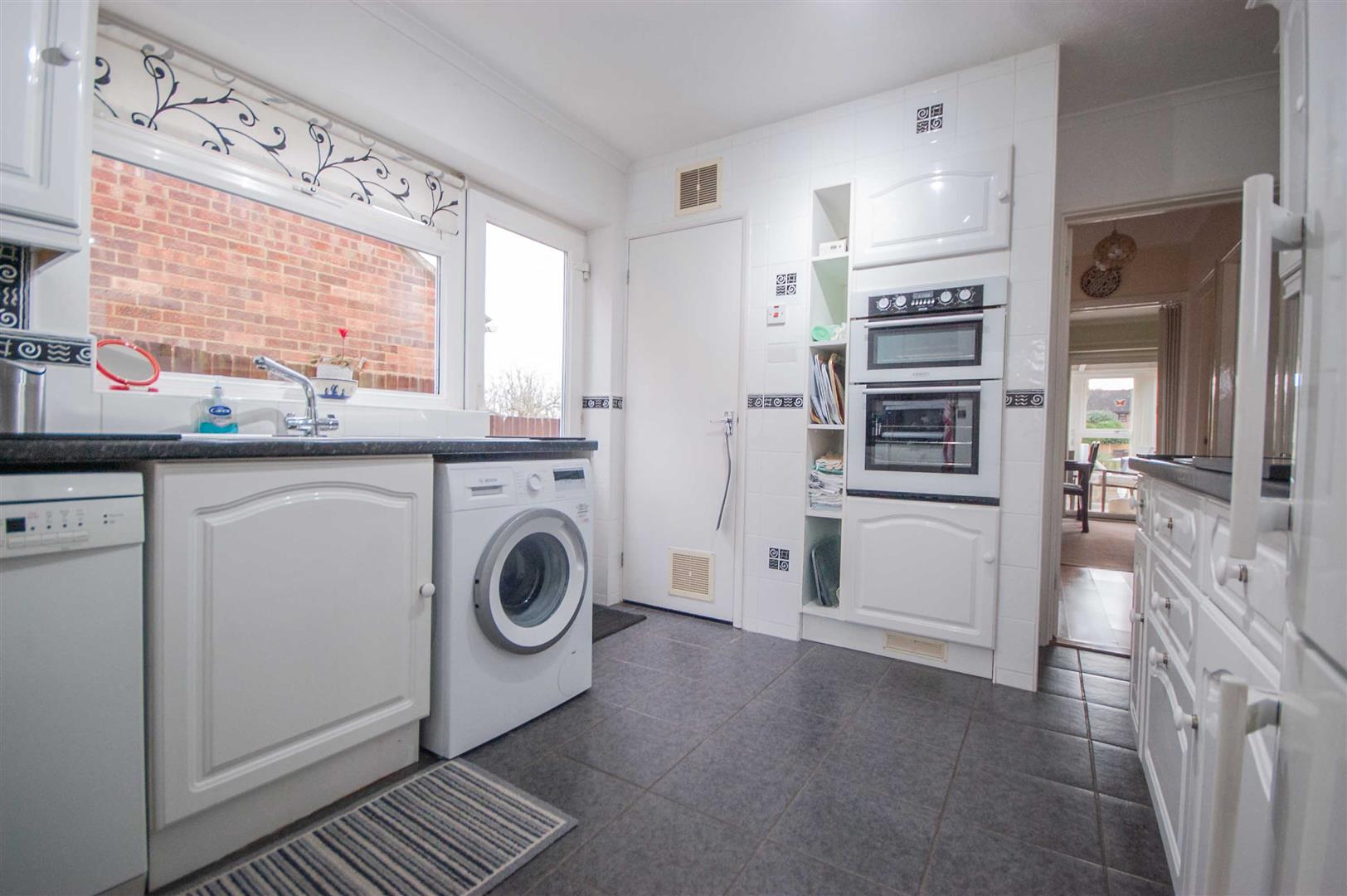 Kitchen: - 3.45m x 2.84m (11'4" x 9'4") - Double glazed window and door to side, range of wall and base units, rolled edge work surfaces with stainless steel sink inset, integrated double oven, electric hob with extractor over, space for fridge freezer, washing machine, dishwasher, cupboard, door to inner hall, radiator, part tiled walls, tiled flooring.