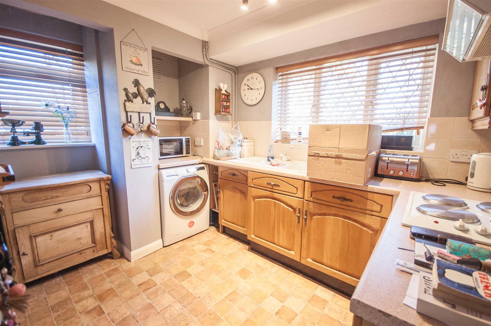 Kitchen: - Dual aspect double glazed windows to rear and side, range of wall and base units, rolled edge work surfaces with sink inset, space for washing machine, integrated low level oven, gas hob with extractor over, cupboard housing fridge freezer, radiator, part tiled walls.