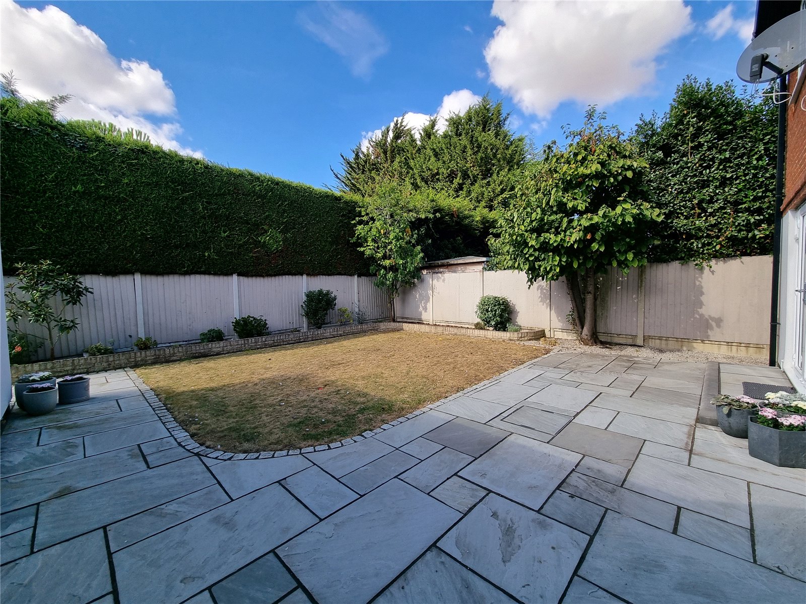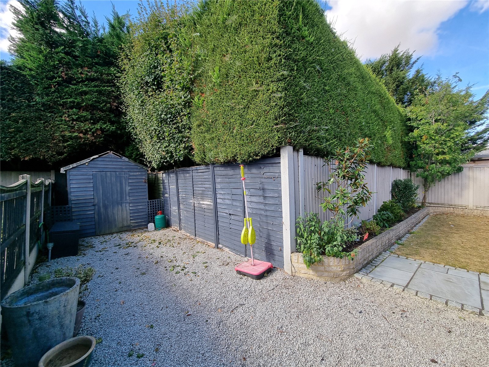 Outside, the rear garden has recently been improved with a new patio and is mainly laid to lawn with a raised bed and borders defined by mature and well-kept conifer bushes. To the side there is a more functional area which houses the oil tank and a shed.