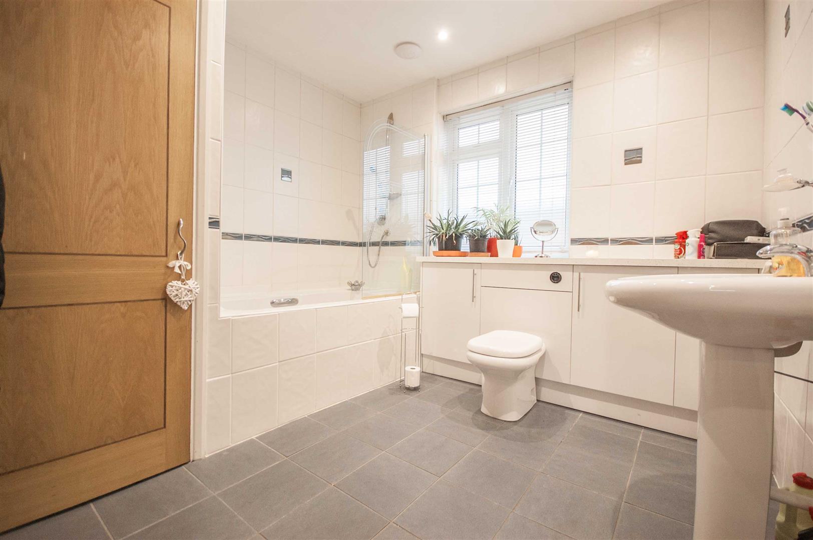 Bathroom: - 2.95m x 2.84m (9'8" x 9'4") - Obscure double glazed window to side, panel bath with shower over, pedestal hand wash basin, low level W/C, towel radiator, cupboard, tiled walls and flooring.
