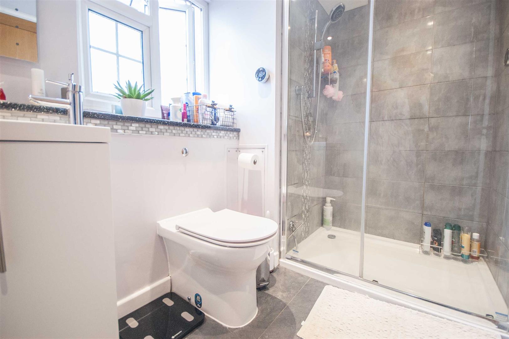 Shower Room: - 2.54m x 1.78m (8'4" x 5'10") - Obscure double glazed window to side, fully tiled double shower cubicle, vanity hand wash basin, low level W/C, chrome towel radiator.