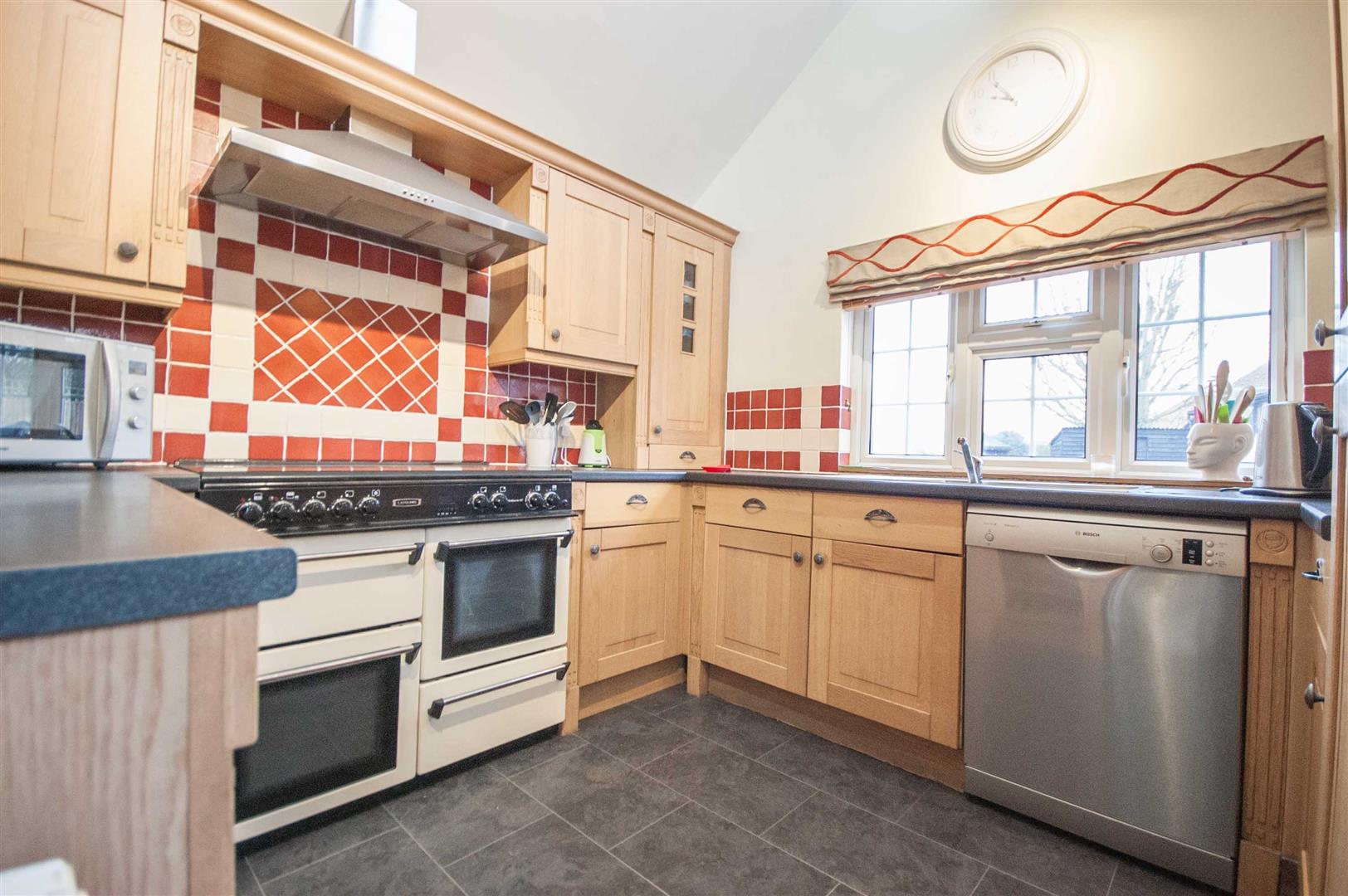 Kitchen: - 2.97m x 2.92m (9'9" x 9'7") - Double glazed window to rear, UPVC door to side, range of wall and base units, rolled edge work surfaces with stainless steel sink inset, integrated fridge freezer, space for leisure cooker with extractor over, dishwasher, radiator, part tiled walls, tiled flooring.