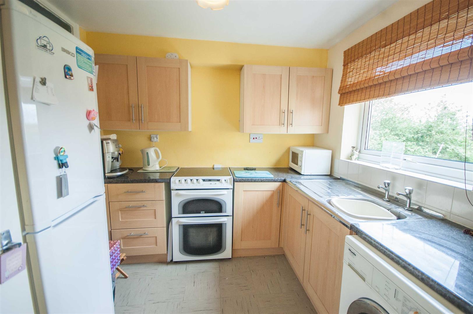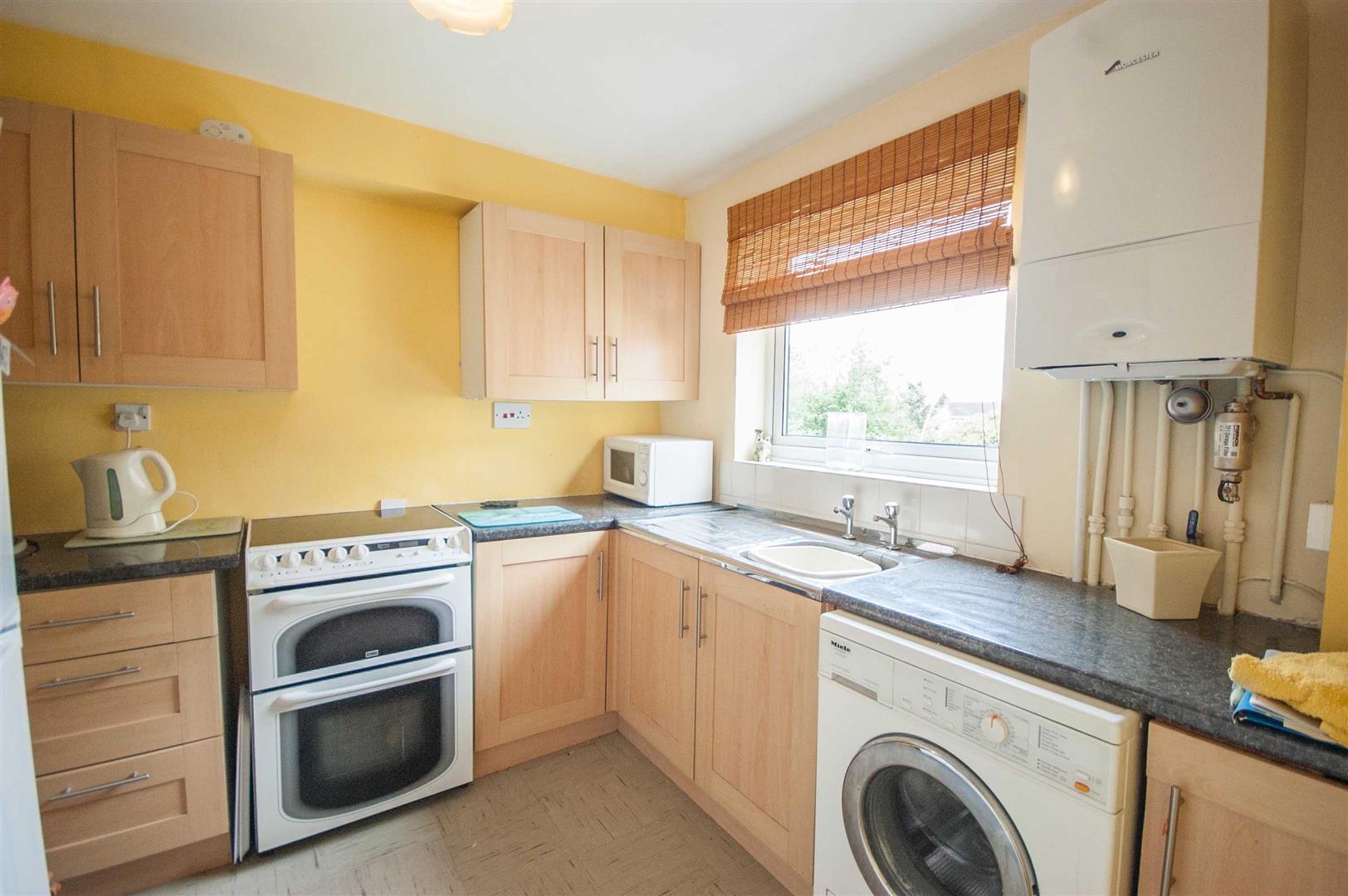 Kitchen: - 2.62m x 2.59m (8'7" x 8'6") - Double glazed window to rear, range of wall and base units, rolled edge work surfaces with stainless steel sink inset, space for fridge freezer, cooker, washing machine, boiler to wall, cupboard, tiled flooring.