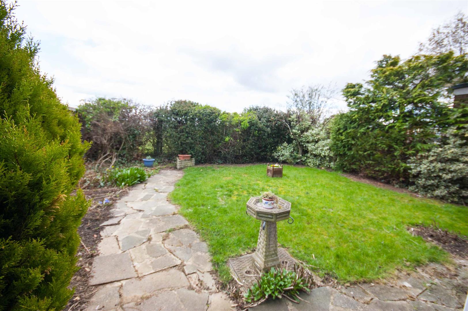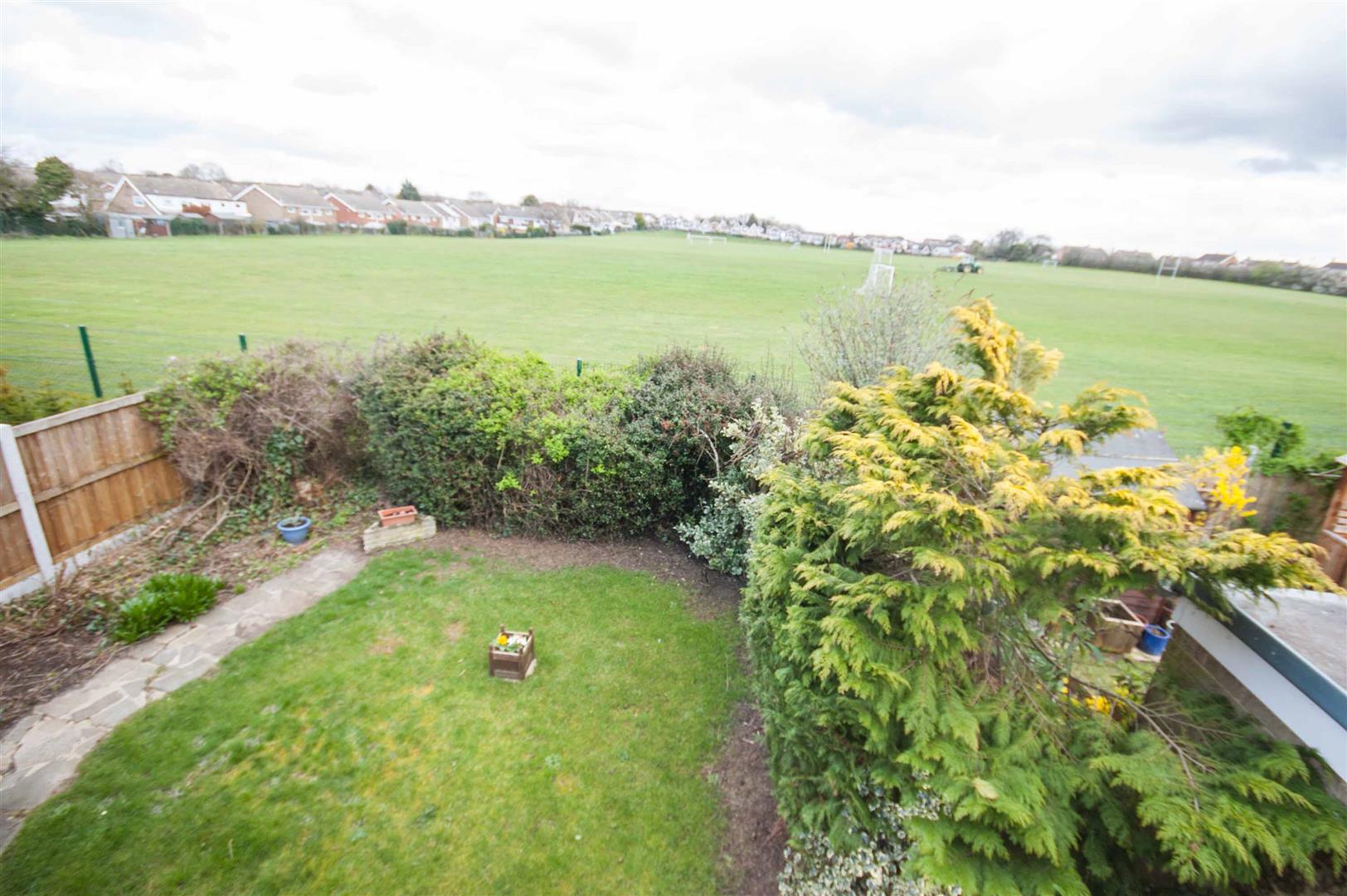 Block paved patio, mainly laid to lawn, backs onto school playing fields (far away from the school itself).