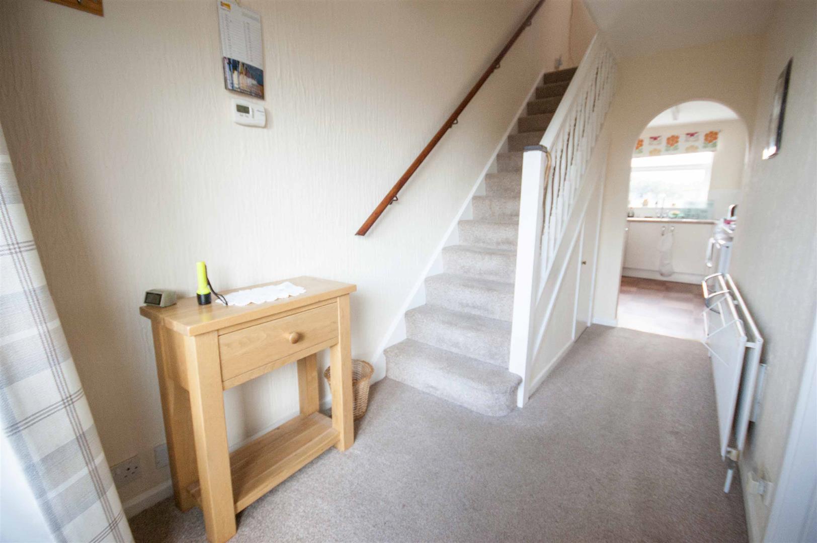 UPVC entrance door to front, stairs to first floor, under stairs cupboard, radiator, doors to lounge and kitchen.