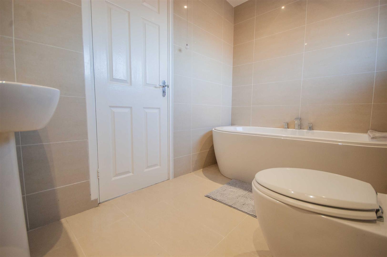 Family Bathroom: - 2.03m x 1.85m (6'8" x 6'1") - Obscure double glazed window to rear, low level W/C, pedestal hand wash basin, radiator, tiled walls and flooring.