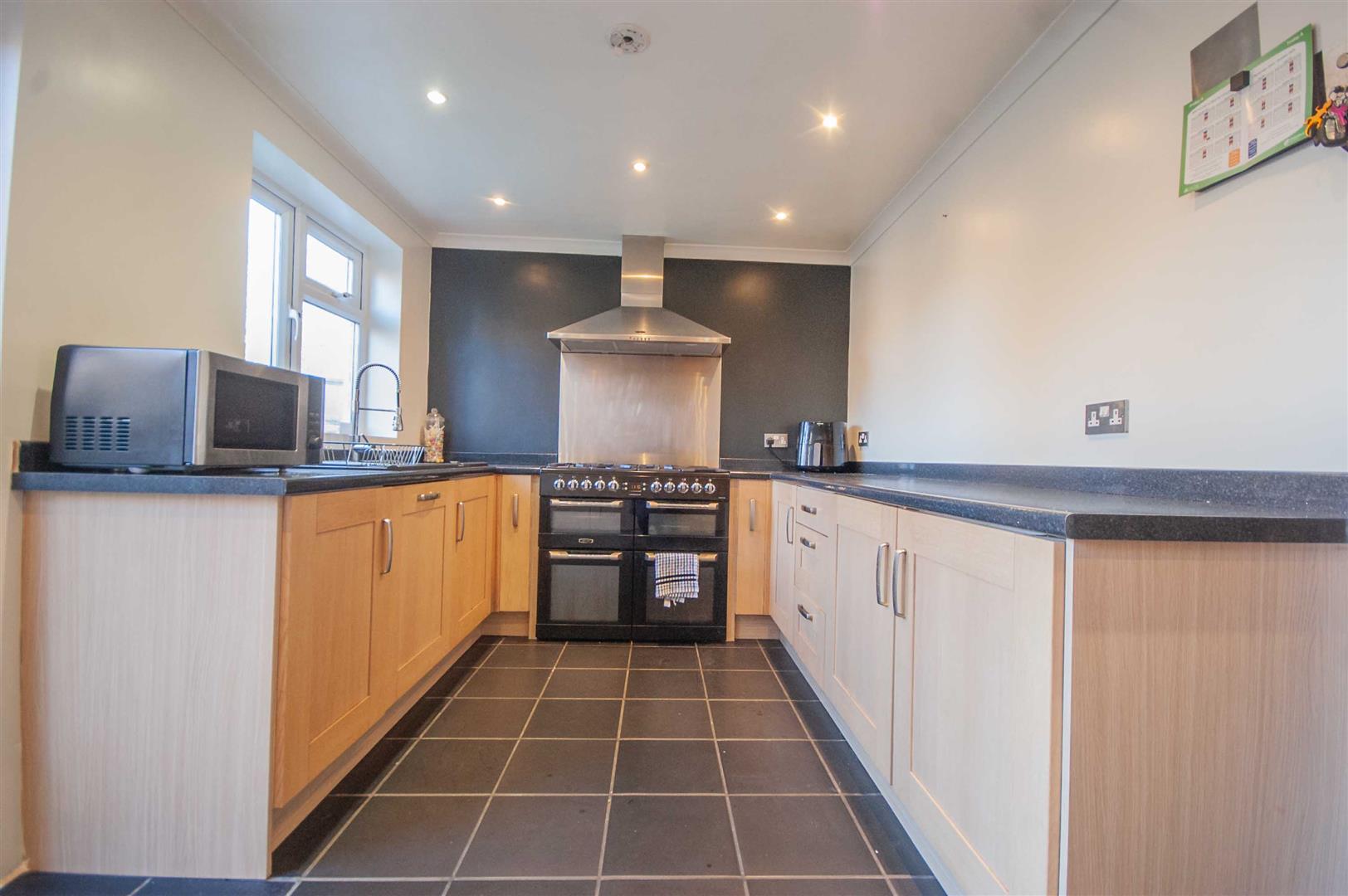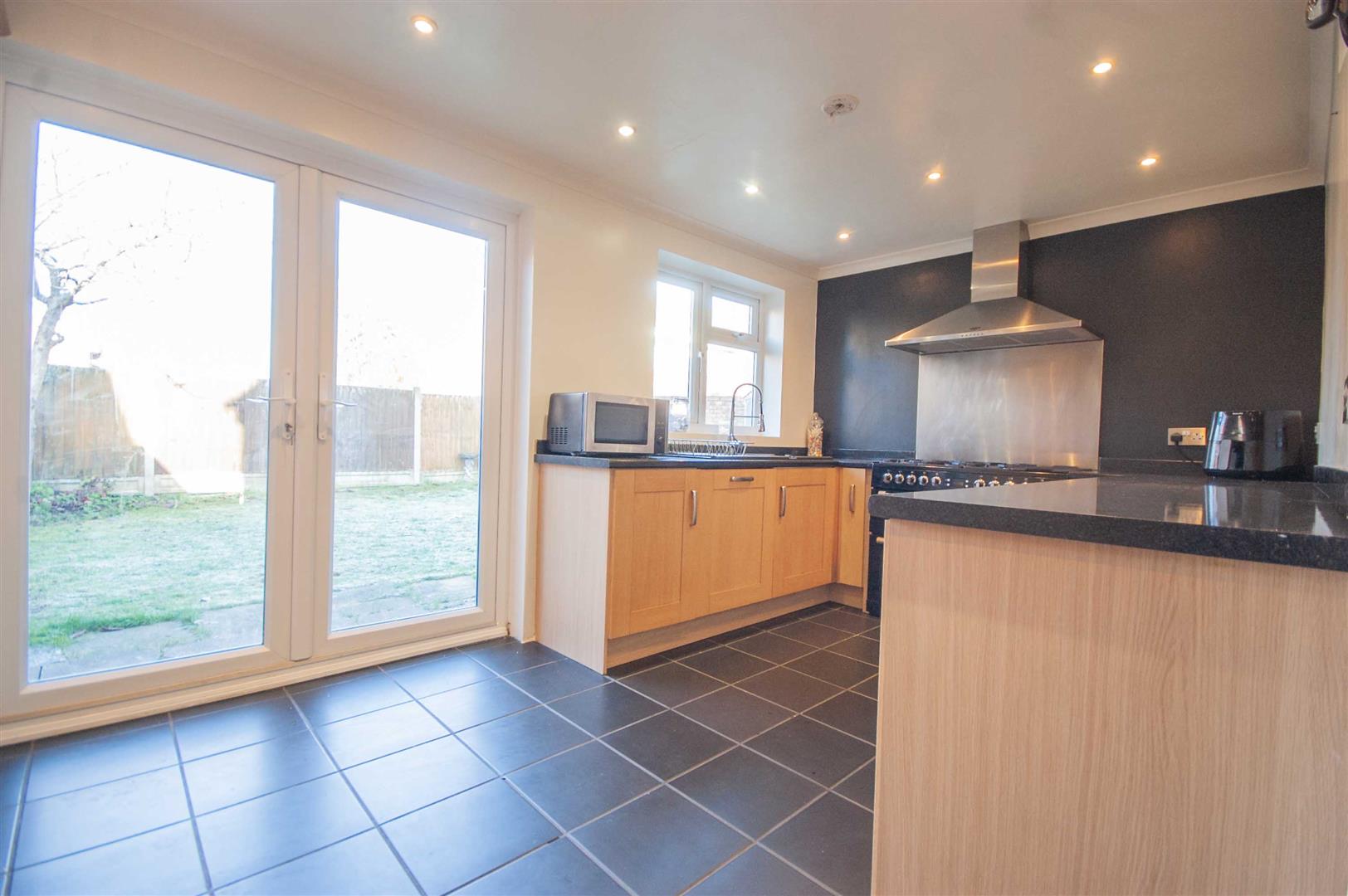 Kitchen: - 4.70m x 2.64m (15'5" x 8'8") - Double glazed window to rear, french doors to rear, range of wall and base units, rolled edge work surfaces with sink inset, integrated dishwasher, space for rangemaster cooker with stainless steel splashback and extractor over, tiled flooring.