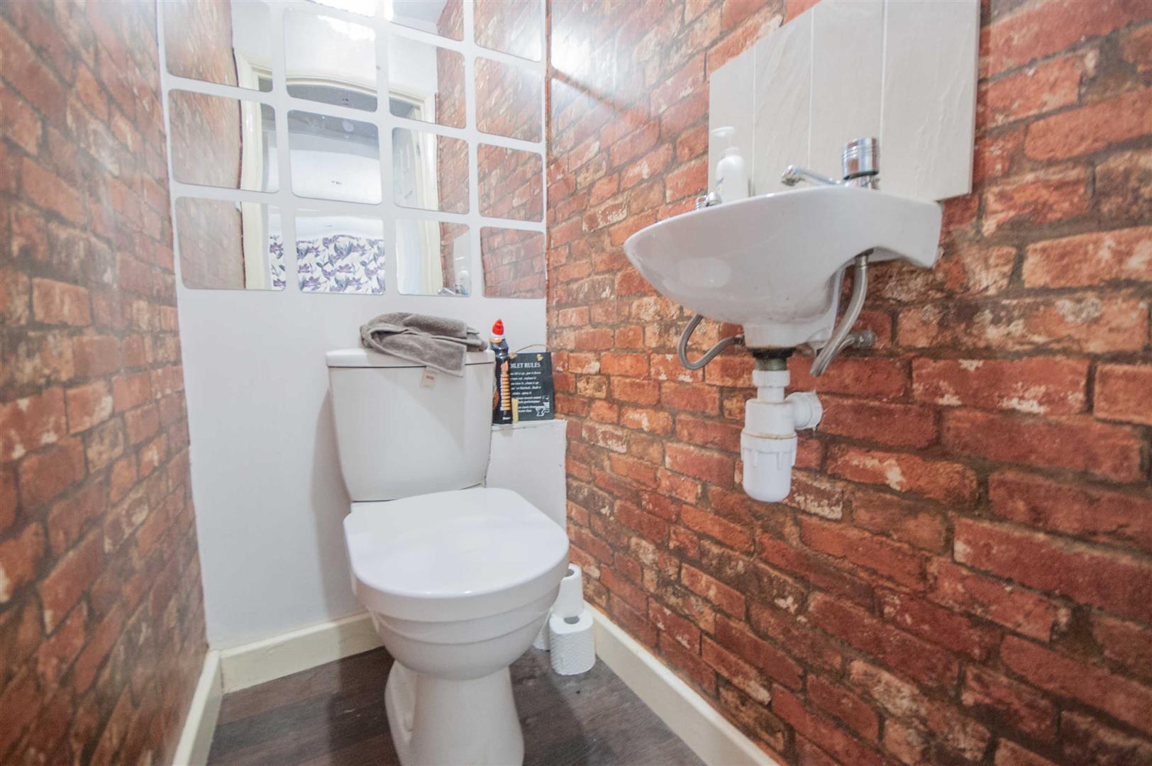 Cloakroom: - Low level W/C, wall mounted hand wash basin, wood effect flooring.