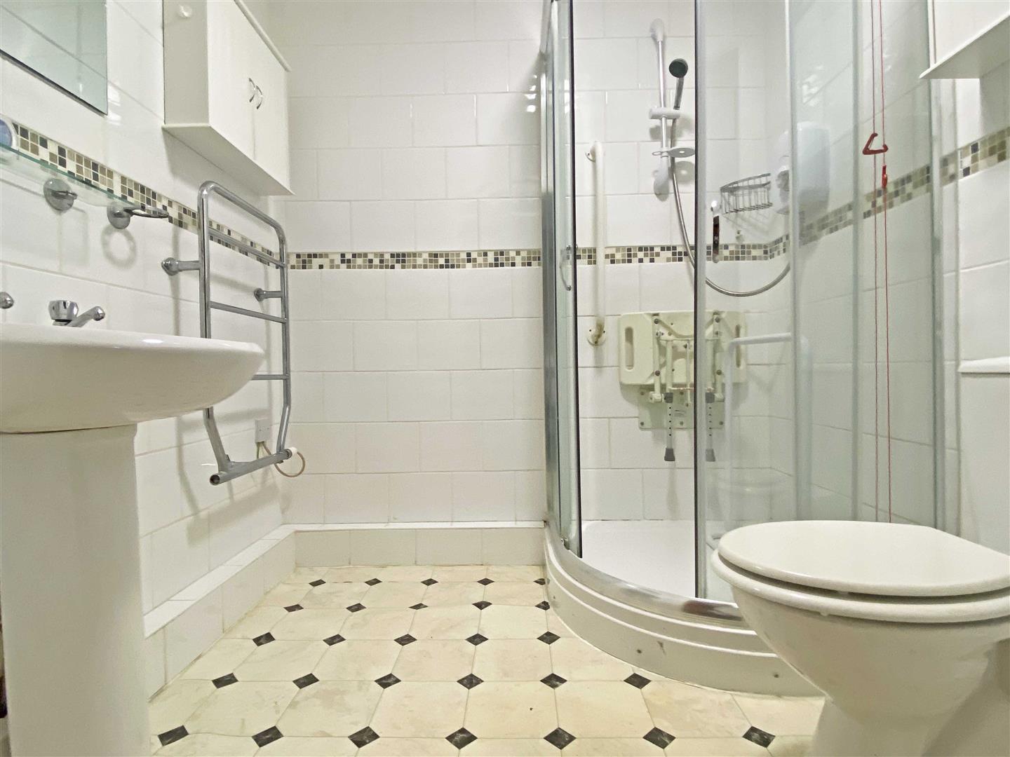 Fully tiled shower cubicle, pedestal hand wash basin, low level W/C, chrome towel radiator, tiled walls.