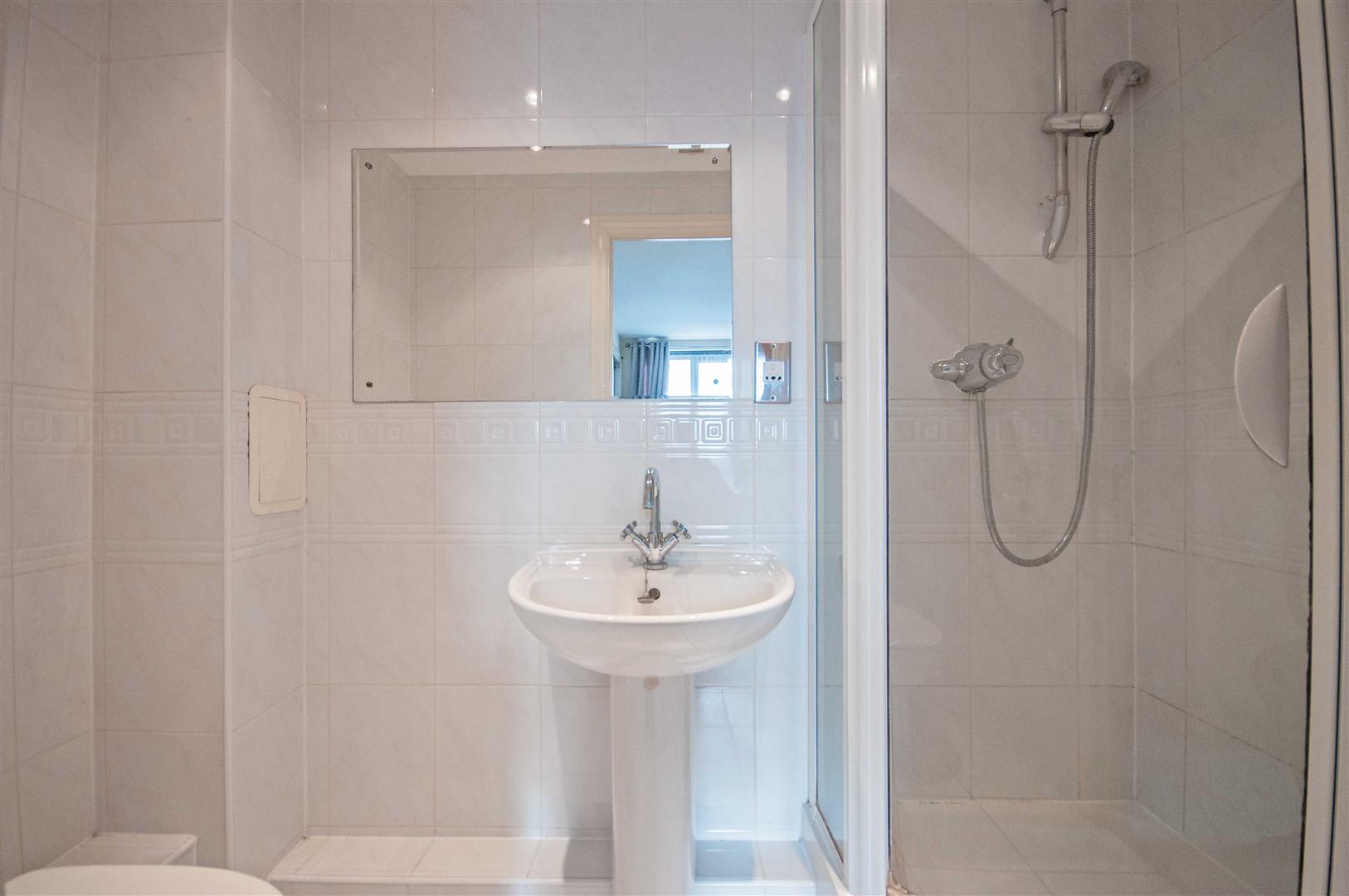 En-Suite: - 2.24m x 1.12m (7'4" x 3'8") - Fully tiled shower cubicle, pedestal hand wash basin, low level W/C, chrome towel radiator, tiled walls and flooring.
