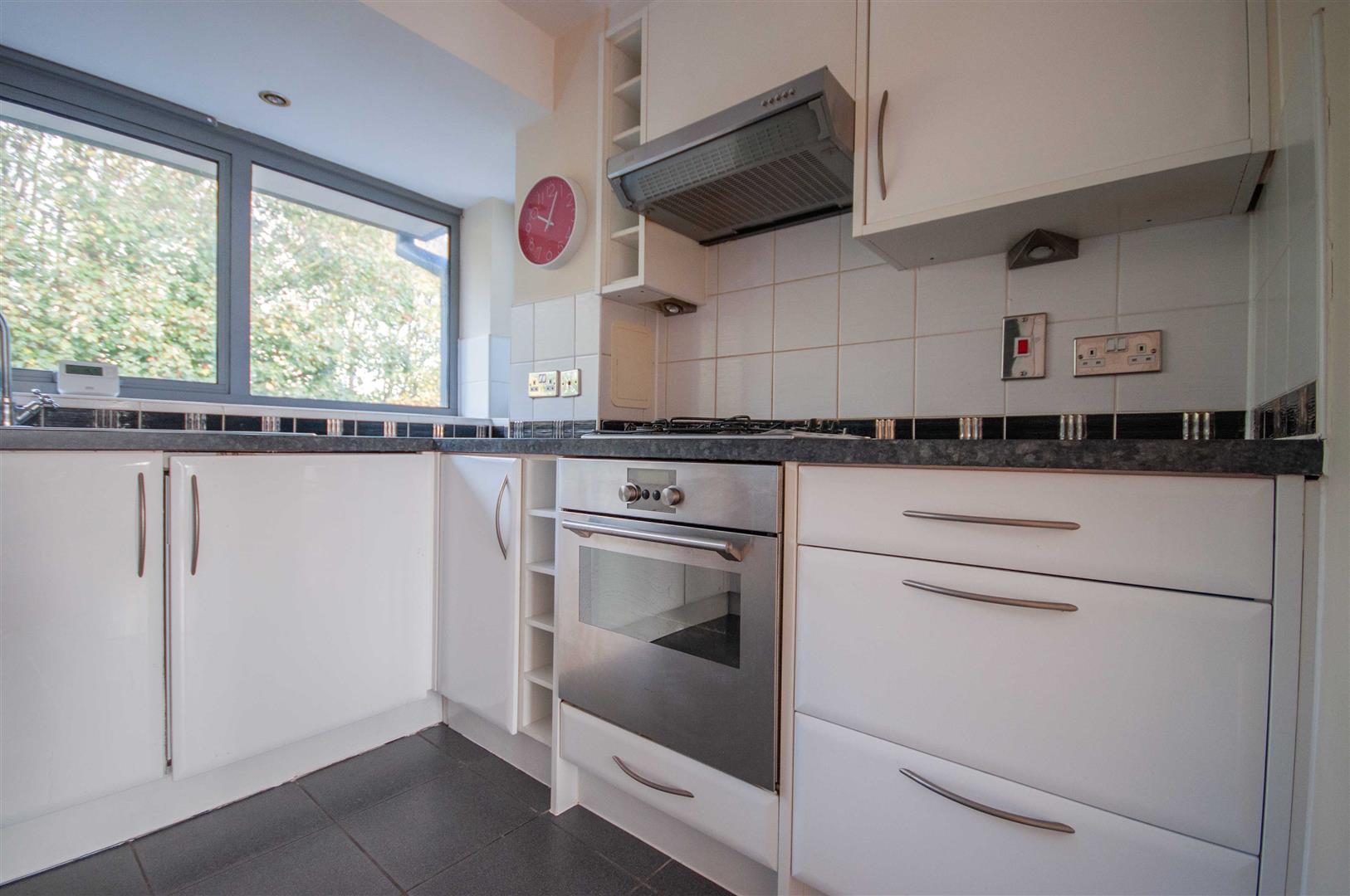 Kitchen: - 2.77m x 2.44m (9'1" x 8') - Double glazed window to rear, range of wall and base units, square edge work surfaces with stainless steel sink, integrated fridge freezer, washing machine, low level oven, gas hob with extractor over, space for dishwasher, part tiled walls, tiled flooring.