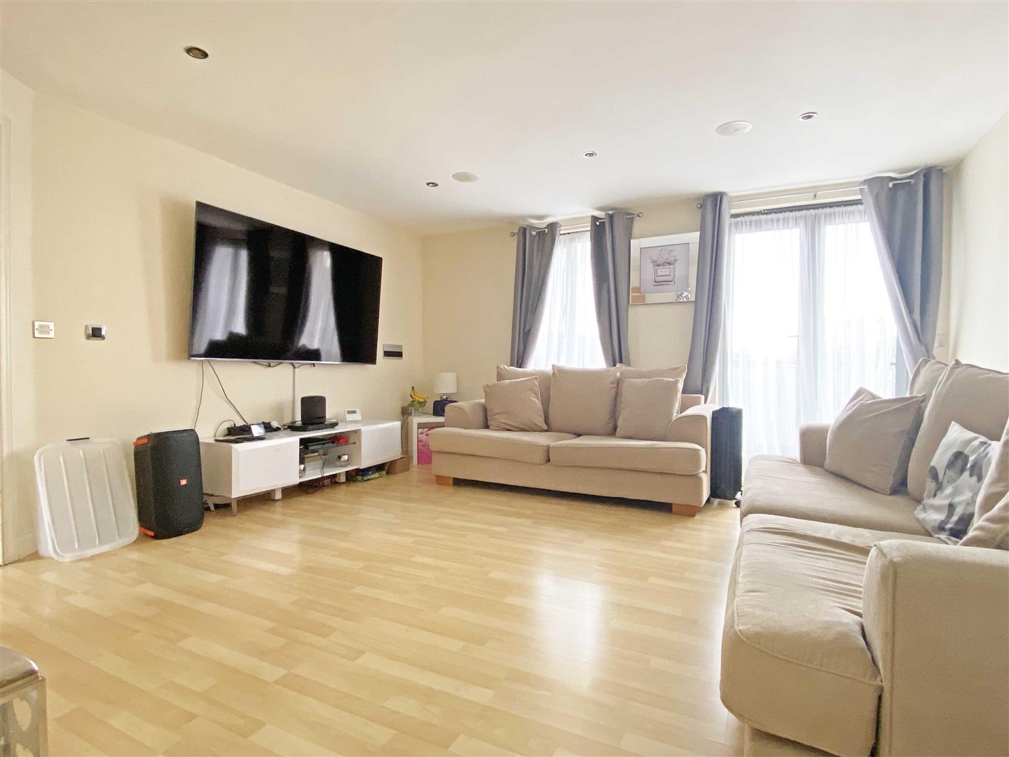 Lounge: - 4.34m x 4.27m (14'3" x 14') - Double glazed window and french doors to balcony, entrance to kitchen, wood effect flooring.
