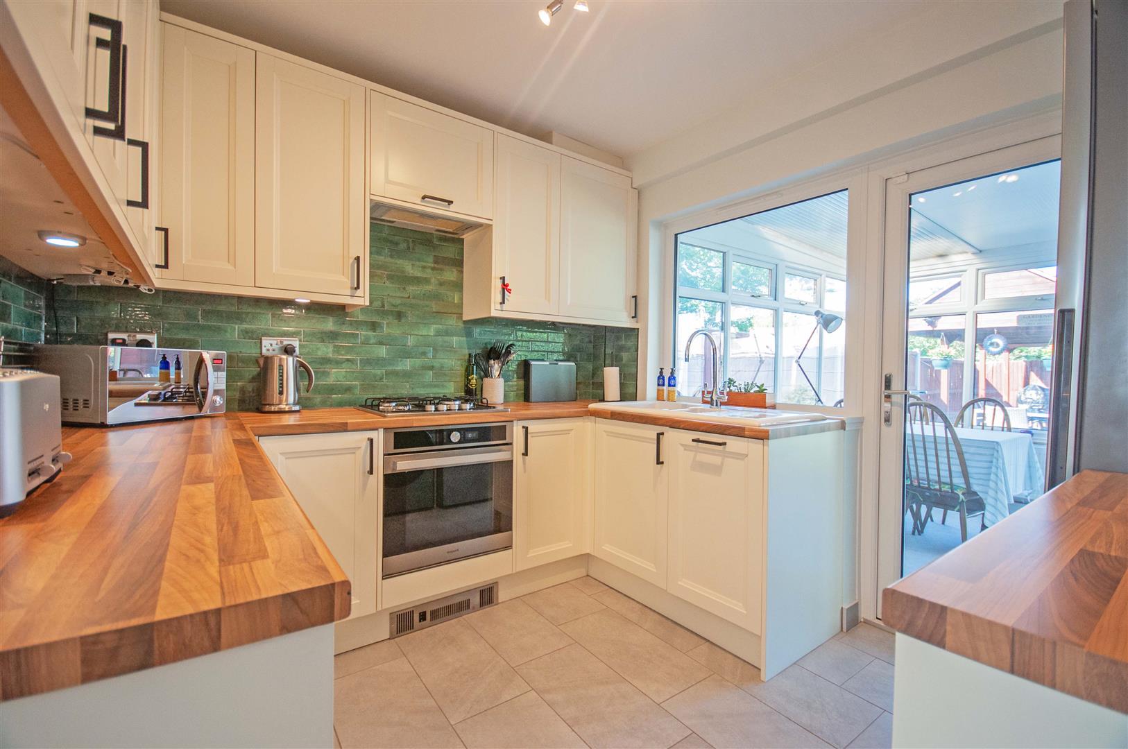 Kitchen: - 2.95m x 2.82m (9'8" x 9'3") - Double glazed windows and door to conservatory, range of walls and base units, rolled edge work surfaces with sink inset, integrated low level oven, gas hob with extractor over, slimline dishwasher, boiler to cupboard, space for fridge freezer, washing machine, part tiled walls, tiled flooring, entrance to inner hall.