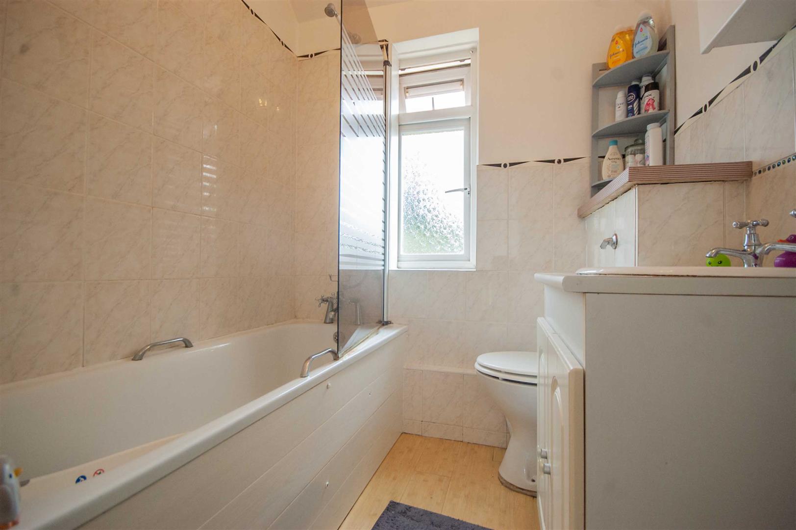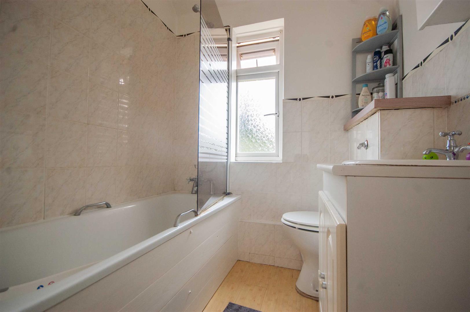 Bathroom: - 2.11m x 1.80m (6'11" x 5'11") - Obscure double glazed window to rear, panel bath with shower over, low level W/C, vanity hand wash basin, chrome towel radiator, part tiled walls, wood effect flooring.