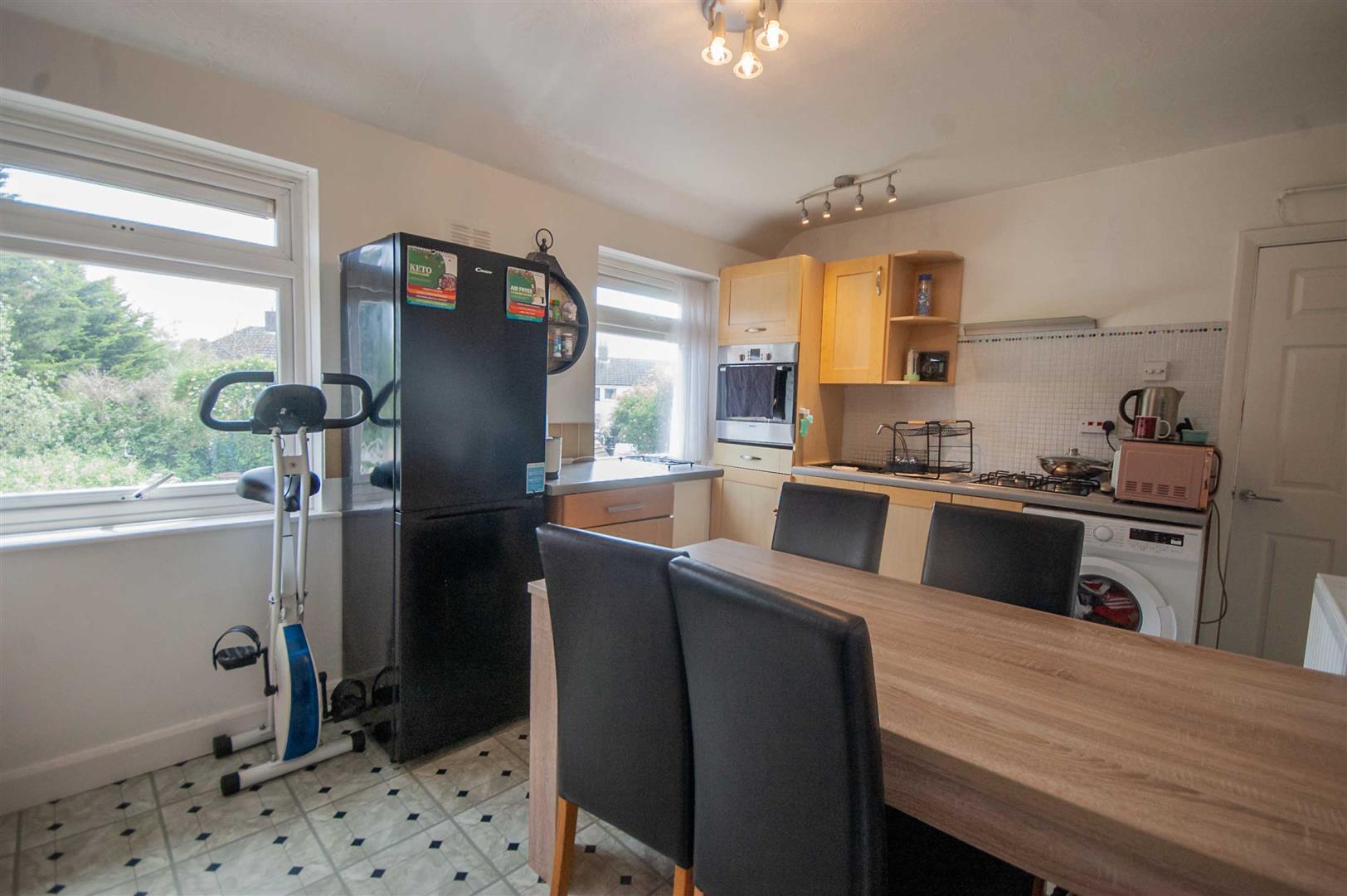 Kitchen Diner: - 4.50m x 2.79m (14'9" x 9'2") - Two double glazed windows to rear, range of wall and base units, rolled edge work surfaces with stainless steel sink inset, integrated oven, gas hob, space for fridge freezer, washing machine, two cupboards, radiator, part tiled walls.