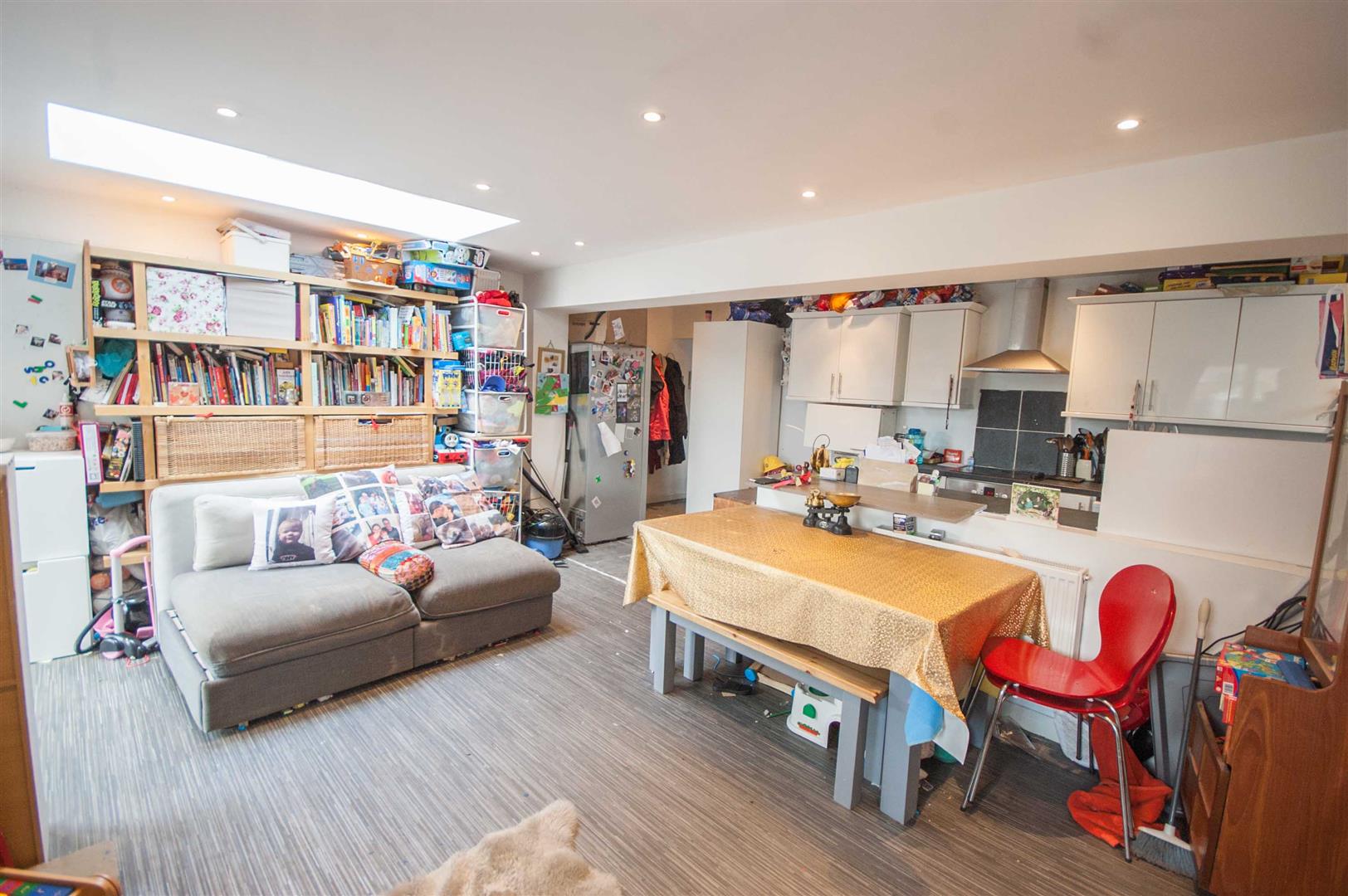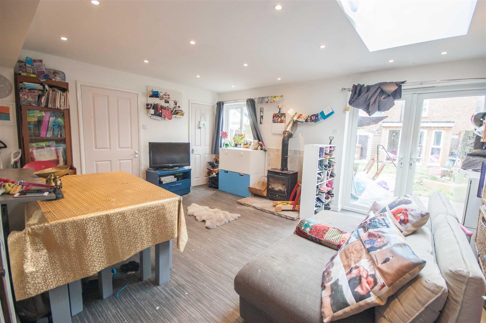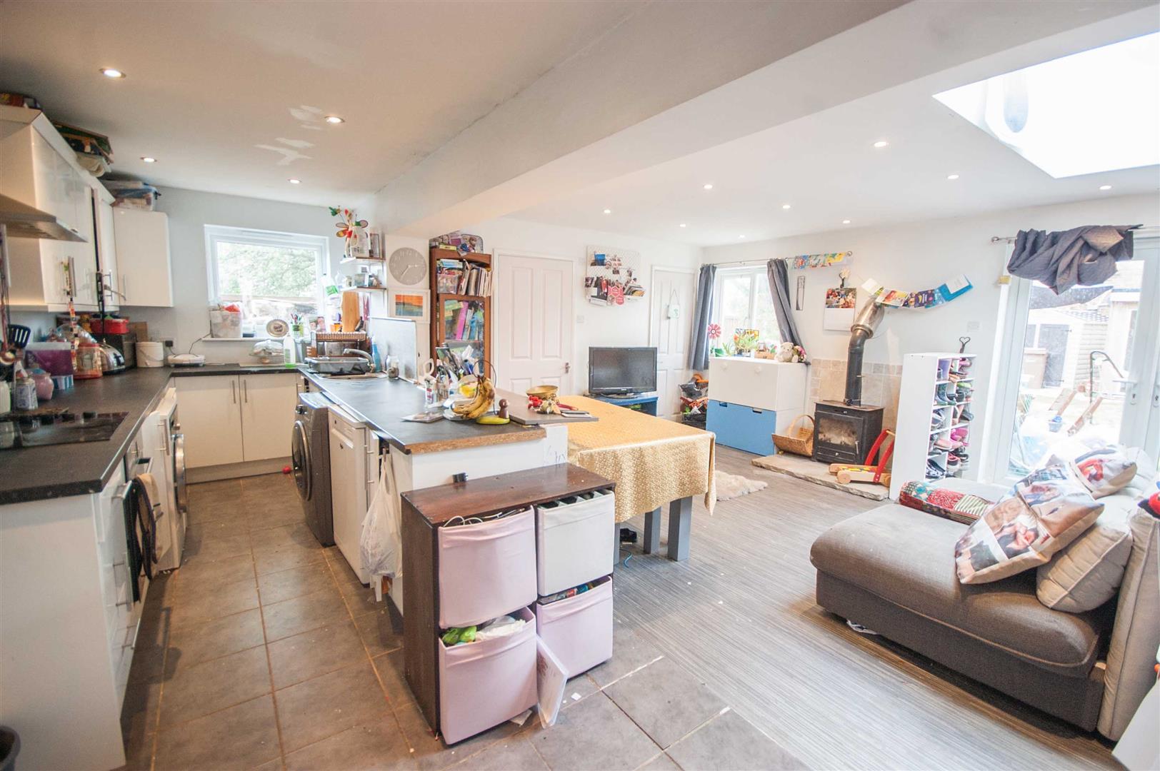 Kitchen Diner/Family Room: - 6.63m > 5.11m x 5.97m (21'9" > 16'9" x 19'7") - Dual aspect double glazed windows to rear and side, double glazed french doors to rear, skylight, range of wall and base units, rolled edge work surfaces with stainless steel sink inset, integrated low level oven, space for washing machine, tumble dryer, dishwasher, American fridge freezer, log burner, wall radiator, door to shower room, cupboard housing solar powered heating system, part tiled flooring.