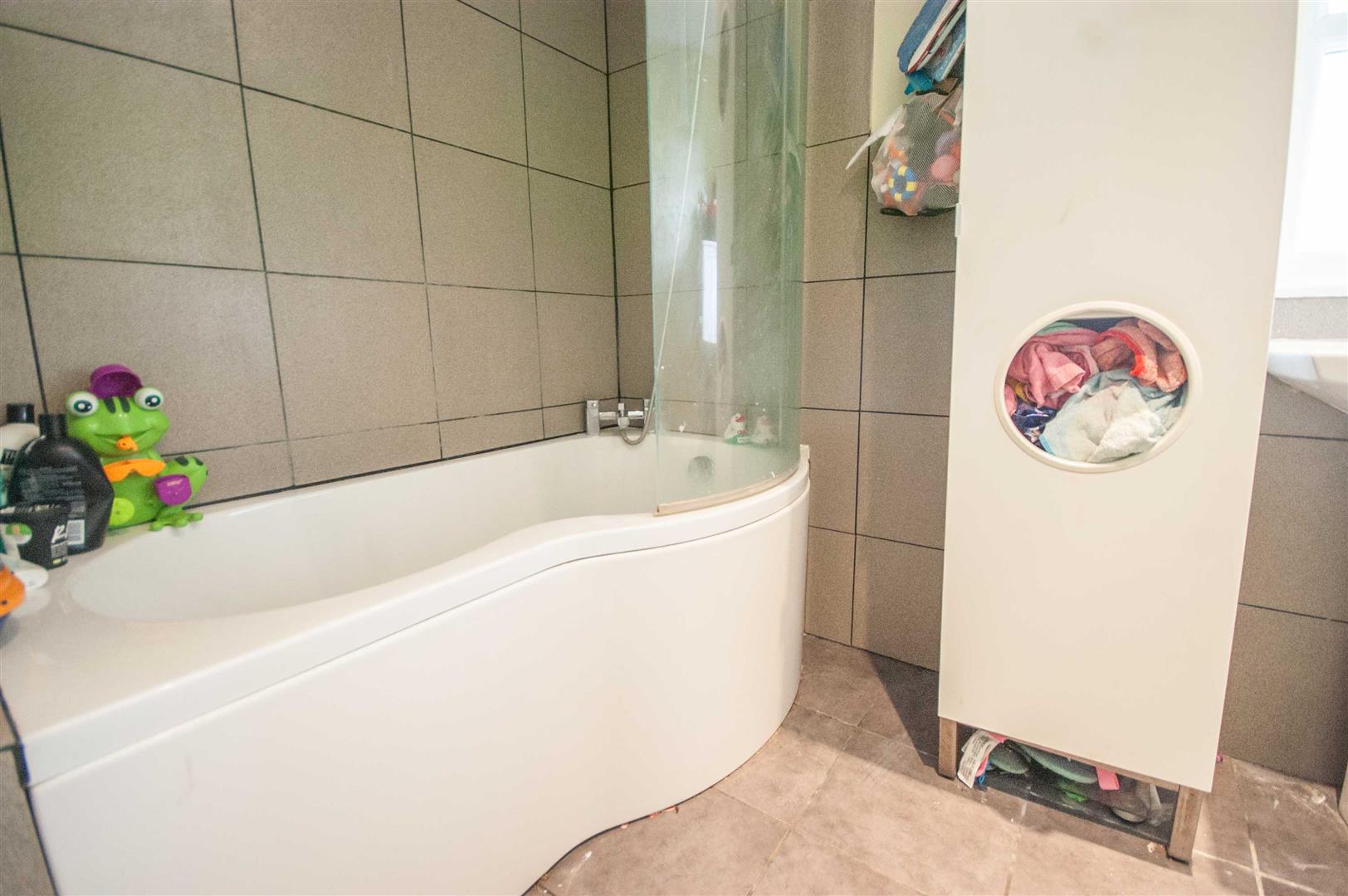 Family Bathroom: - 2.51m x 1.57m (8'3" x 5'2") - Obscure double glazed window to front, p shape bath with shower over, pedestal hand wash basin, low level W/C, part tiled walls, tiled flooring.