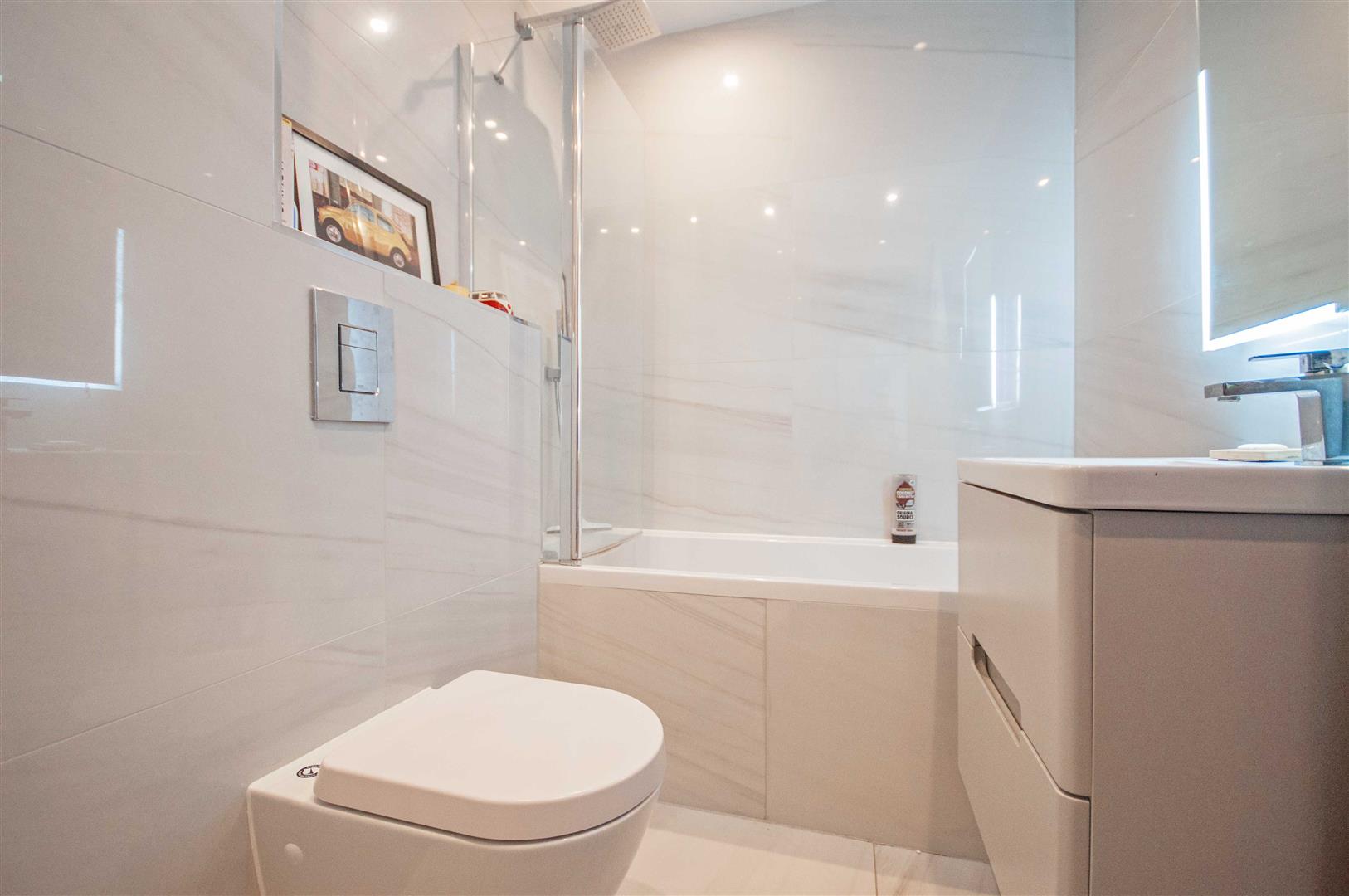 Bathroom: - 2.13m x 1.70m (7' x 5'7") - Panel bath with shower over, low level W/C, vanity hand wash basin, chrome towel radiator, tiled walls and flooring.