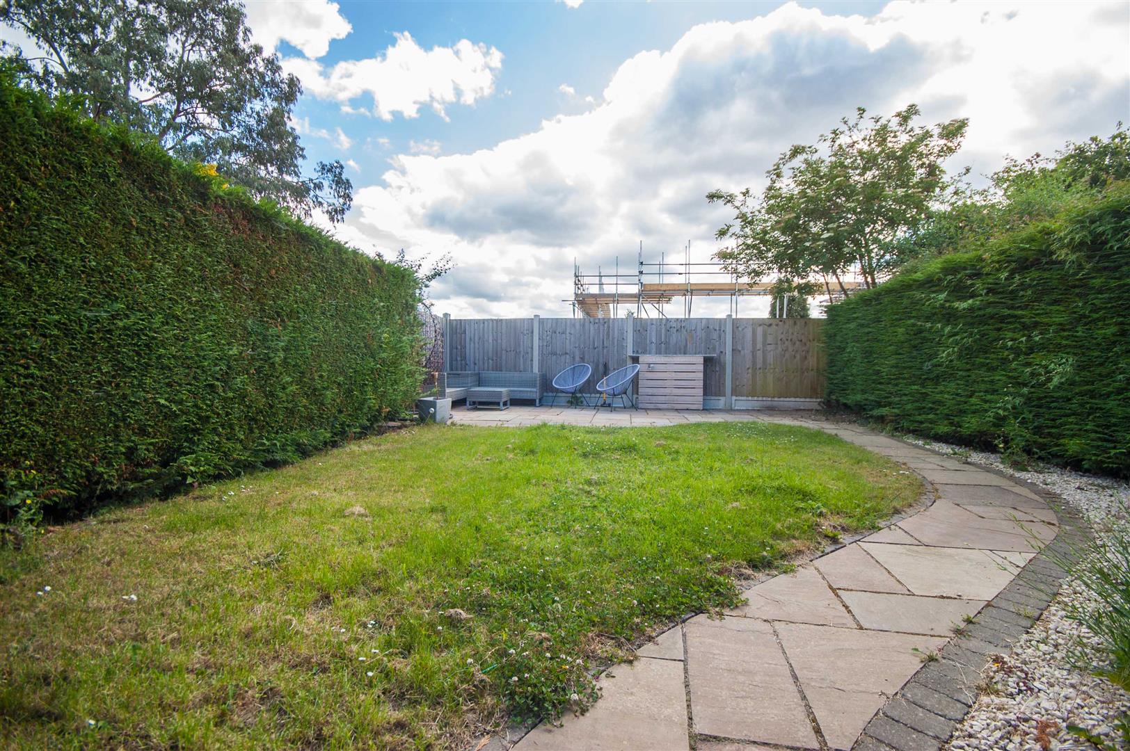 A landscaped private rear garden that measures 37' approx and is mainly laid to lawn, with Indian Sandstone pathway and rear patio, plus further shed.