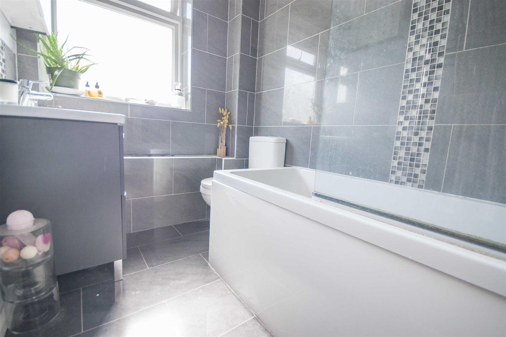 Obscure double glazed window to rear, recently refitted modern bathroom with panelled bath with shower over, vanity wash hand basin, low level WC, chrome towel radiator, tiled to floor and walls.