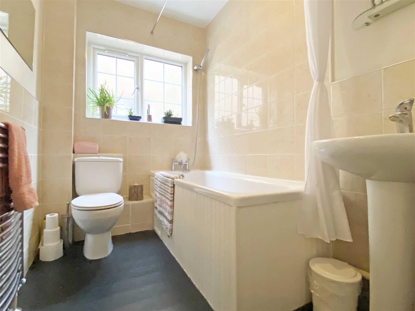 Family Bathroom: - 2.46m x 1.60m (8'1" x 5'3") - Obscure double glazed window to side, panel bath with shower mixer tap, low level W/C, pedestal hand wash basin, chrome towel radiator, tiled walls.