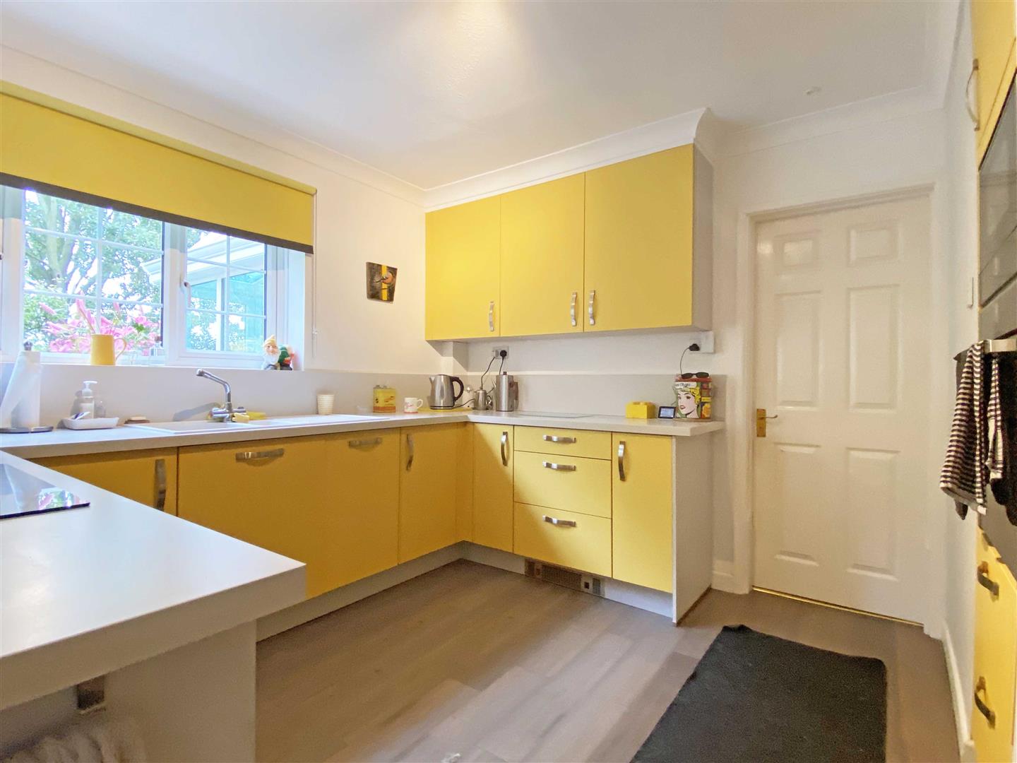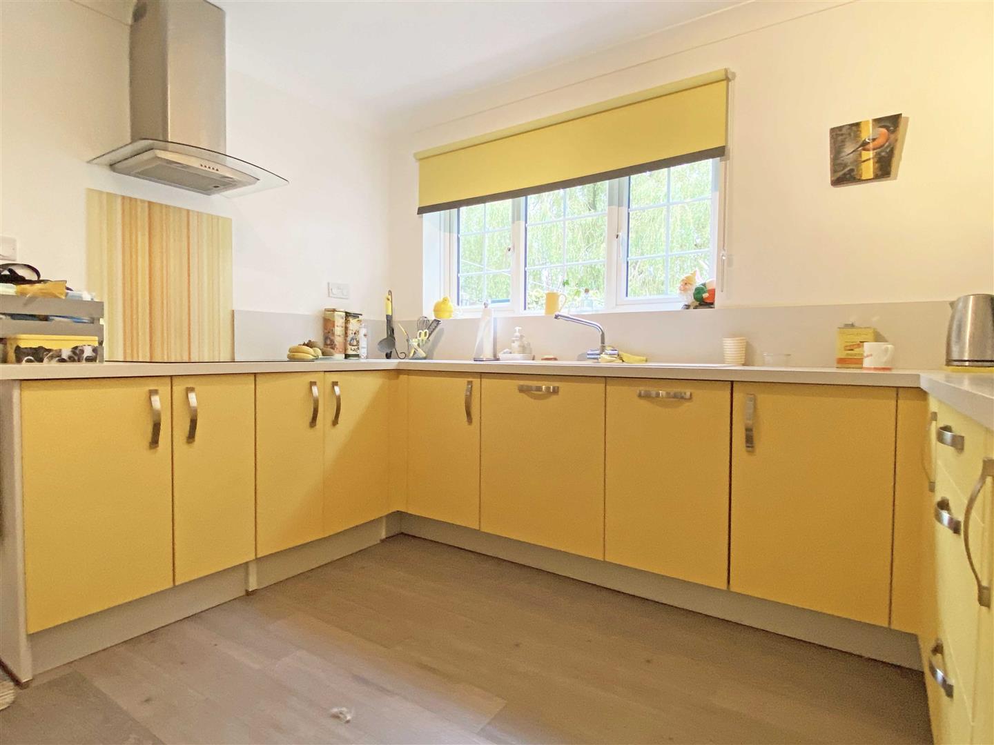 Kitchen: - 4.22m > 2.92m x 3.33m (13'10" > 9'7" x 10'11") - Double glazed window to rear, door to side, range of wall and base units, square edge work surfaces with sink inset, integrated induction hob with extractor over, double oven, dishwasher, space for washing machine, tumble dryer, fridge freezer, cupboard.