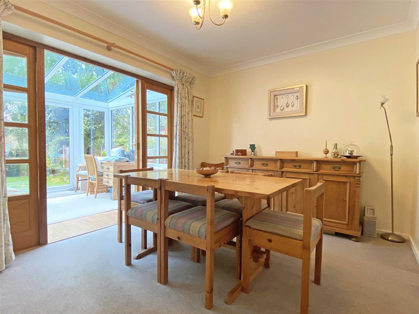 Dining Room: - 3.35m x 2.84m (11' x 9'4") - Double doors to conservatory, door to kitchen, radiator.
