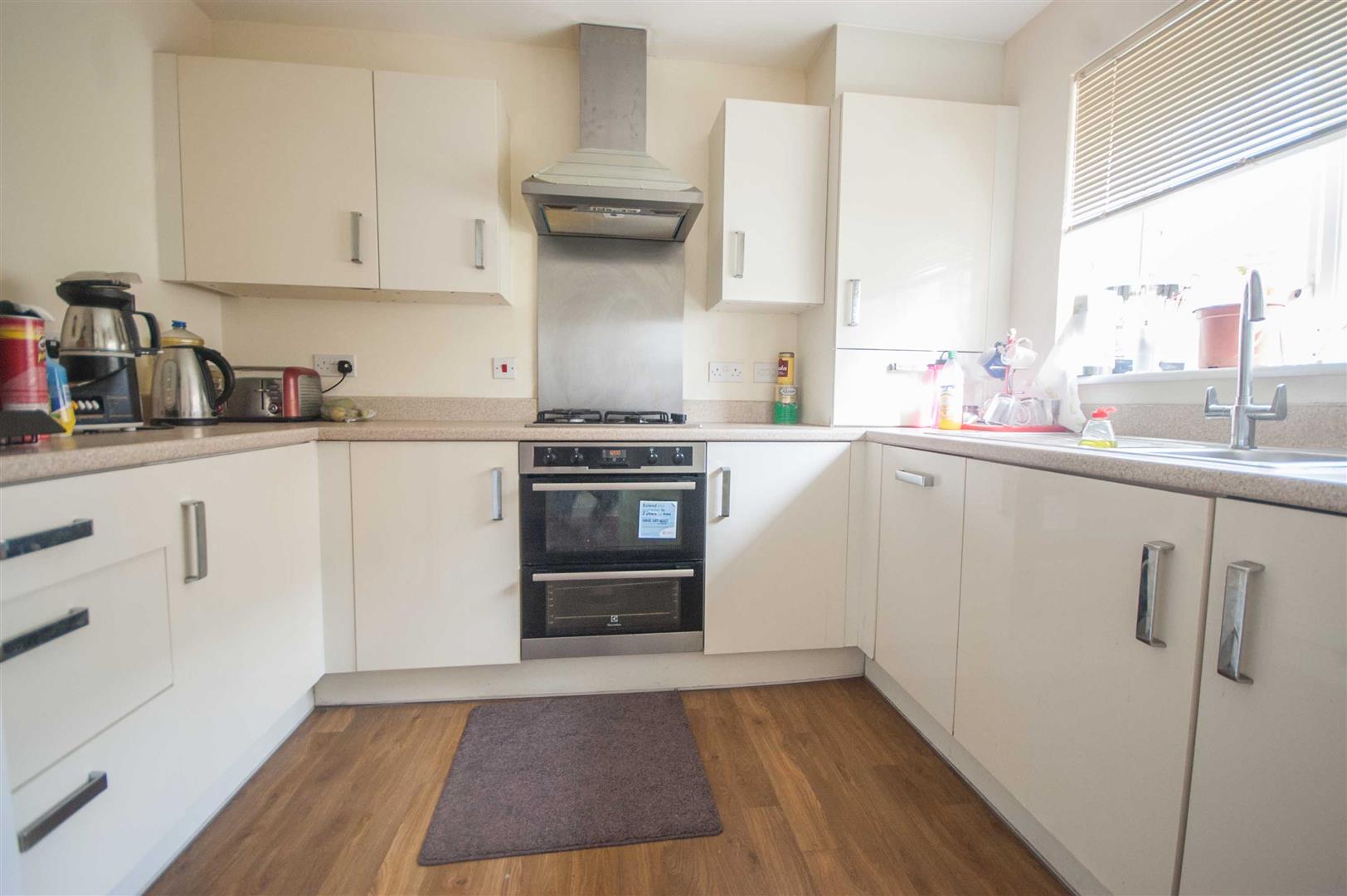 Kitchen: - 2.97m x 2.49m (9'9" x 8'2") - Double glazed window to front, range of wall and base units, rolled edge work surface with stainless steel sink inset, integrated fridge freezer, washing machine, dishwasher, low level double oven, gas hob with stainless steel splashback and extractor over, boiler to cupboard, radiator, wood effect flooring.