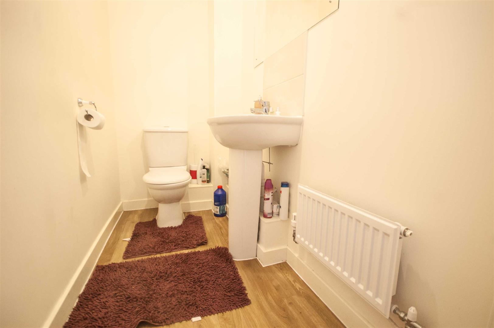 Cloakroom: - Low level W/C, pedestal hand wash basin, radiator, wood effect flooring.