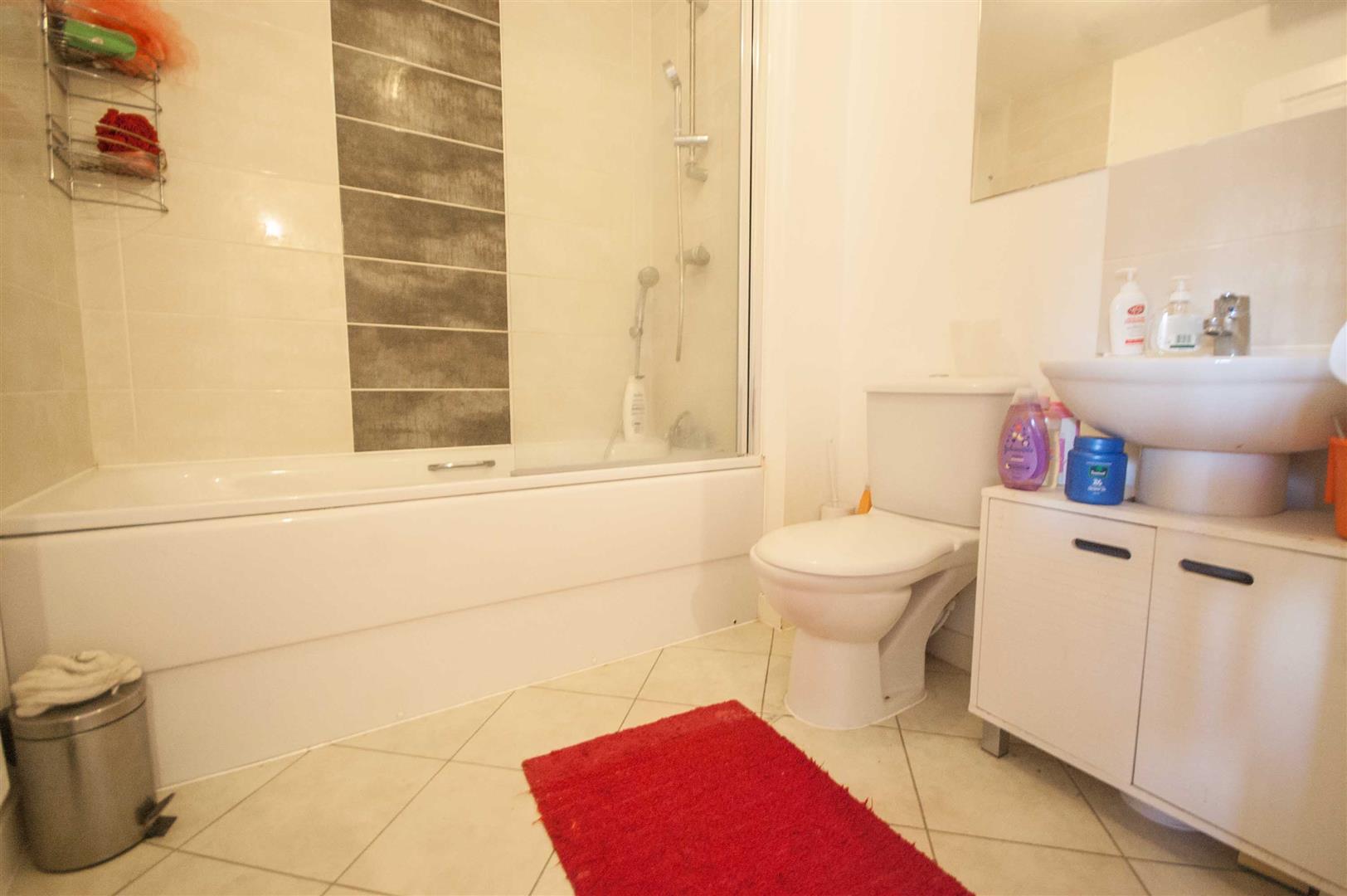 Family Bathroom: - 2.11m x 1.96m (6'11" x 6'5") - Panel bath with shower mixer tap and shower over, pedestal hand wash basin, low level W/C, radiator, part tiled walls, tiled flooring.