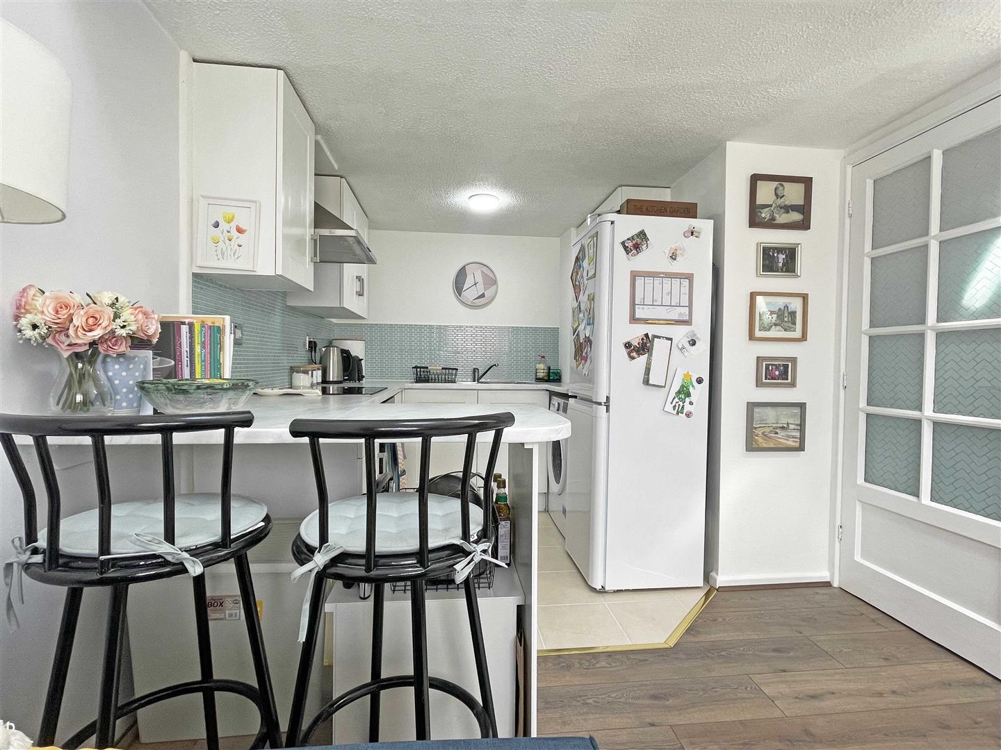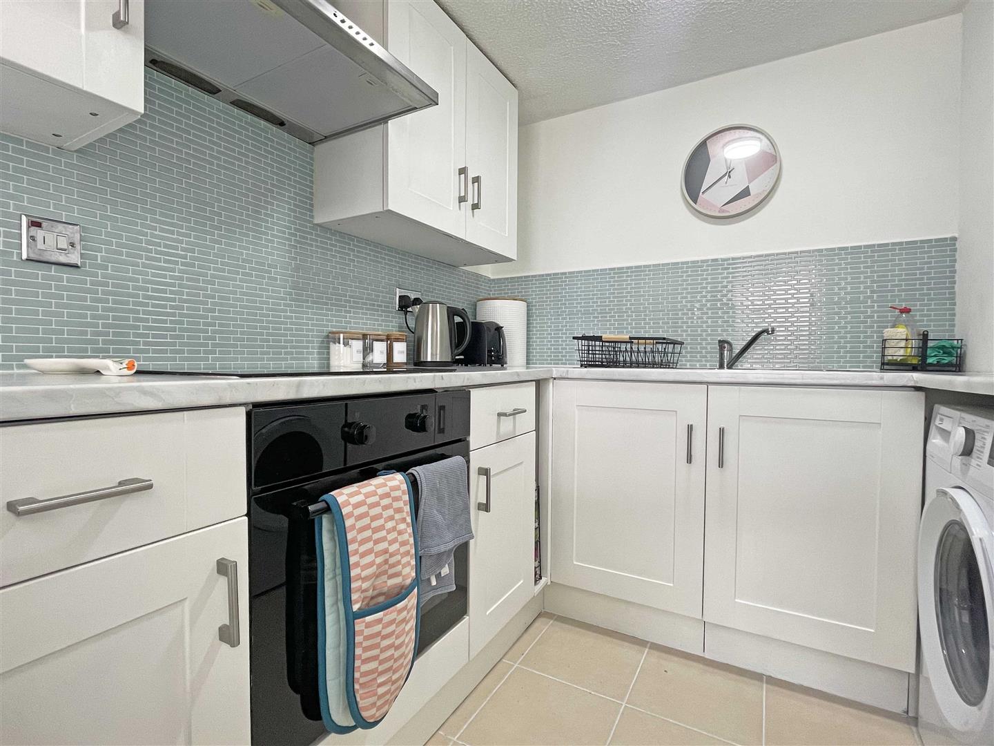 Kitchen:- - 2.31m x 1.80m (7'07" x 5'11") - Double glazed window to front, square edge worktops with stainless drainer sink inset, tiled splash-backs, induction hob with extractor over, matching wall and base units with integrated electric oven, space for washing machine and fridge freezer, tiled flooring.