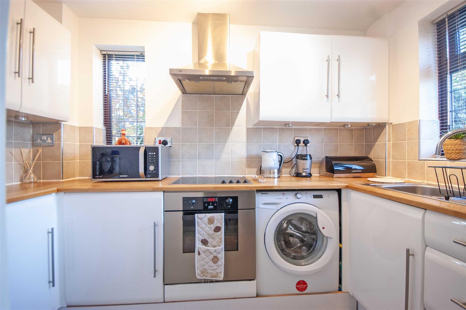 Kitchen: - 2.95m x 1.70m (9'8" x 5'7") - Dual aspect double glazed windows to side and rear, range of wall and base units, rolled edge work surfaces with stainless steel sink inset, integrated hob with extractor over, low level oven, space for washing machine, part tiled walls, tiled flooring.
