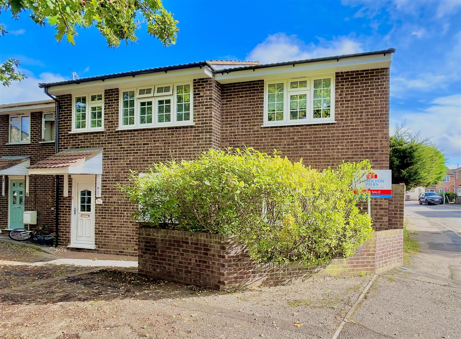Frontage & Driveway: - Paved driveway parking for multiple cars, mature shrubs to border.