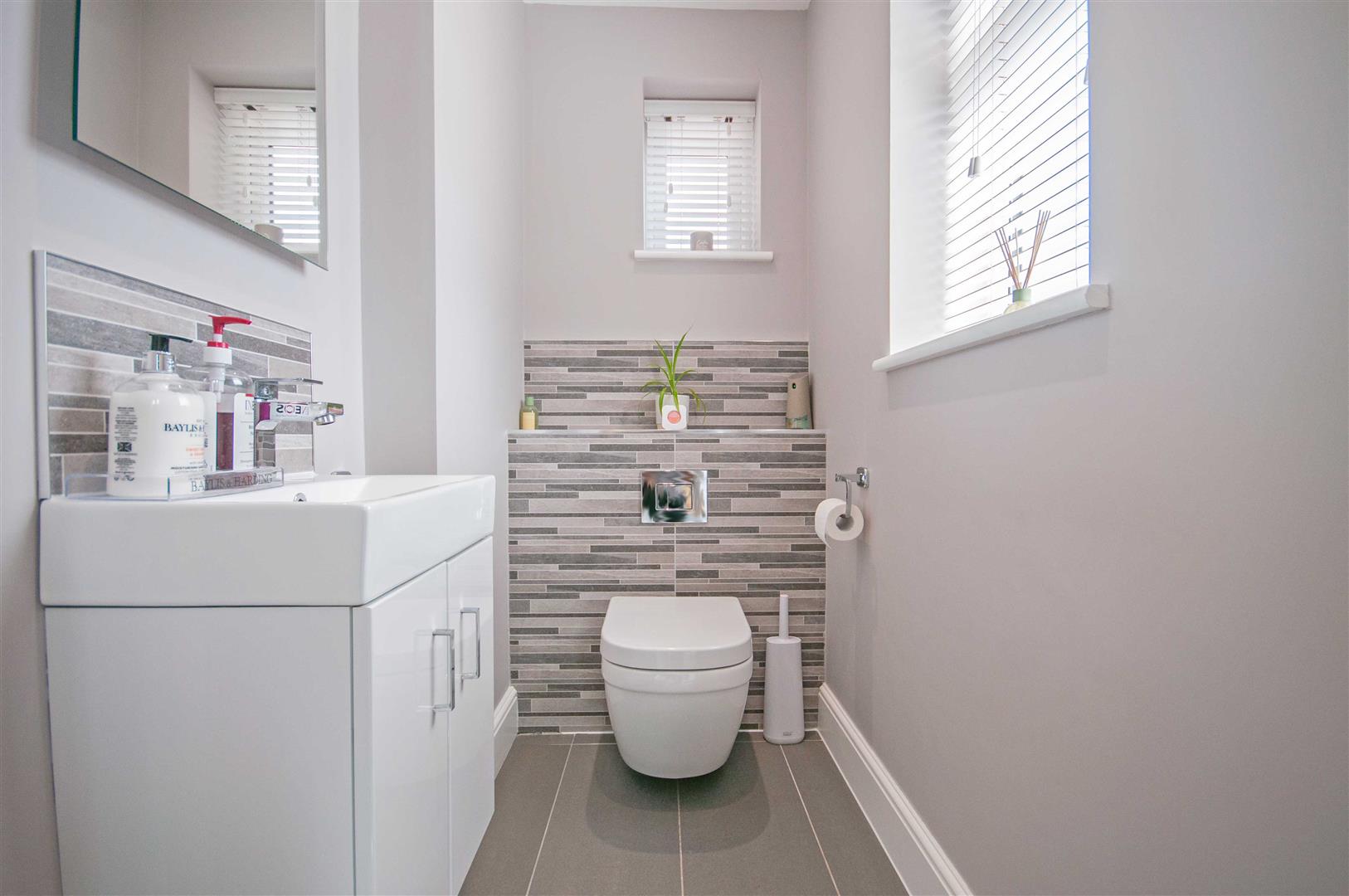 Cloakroom: - Obscure double glazed window to front and side, low level W/C, vanity hand wash basin, part tiled walls, tiled flooring, under floor heating.