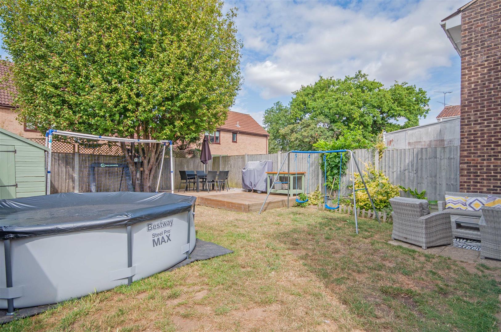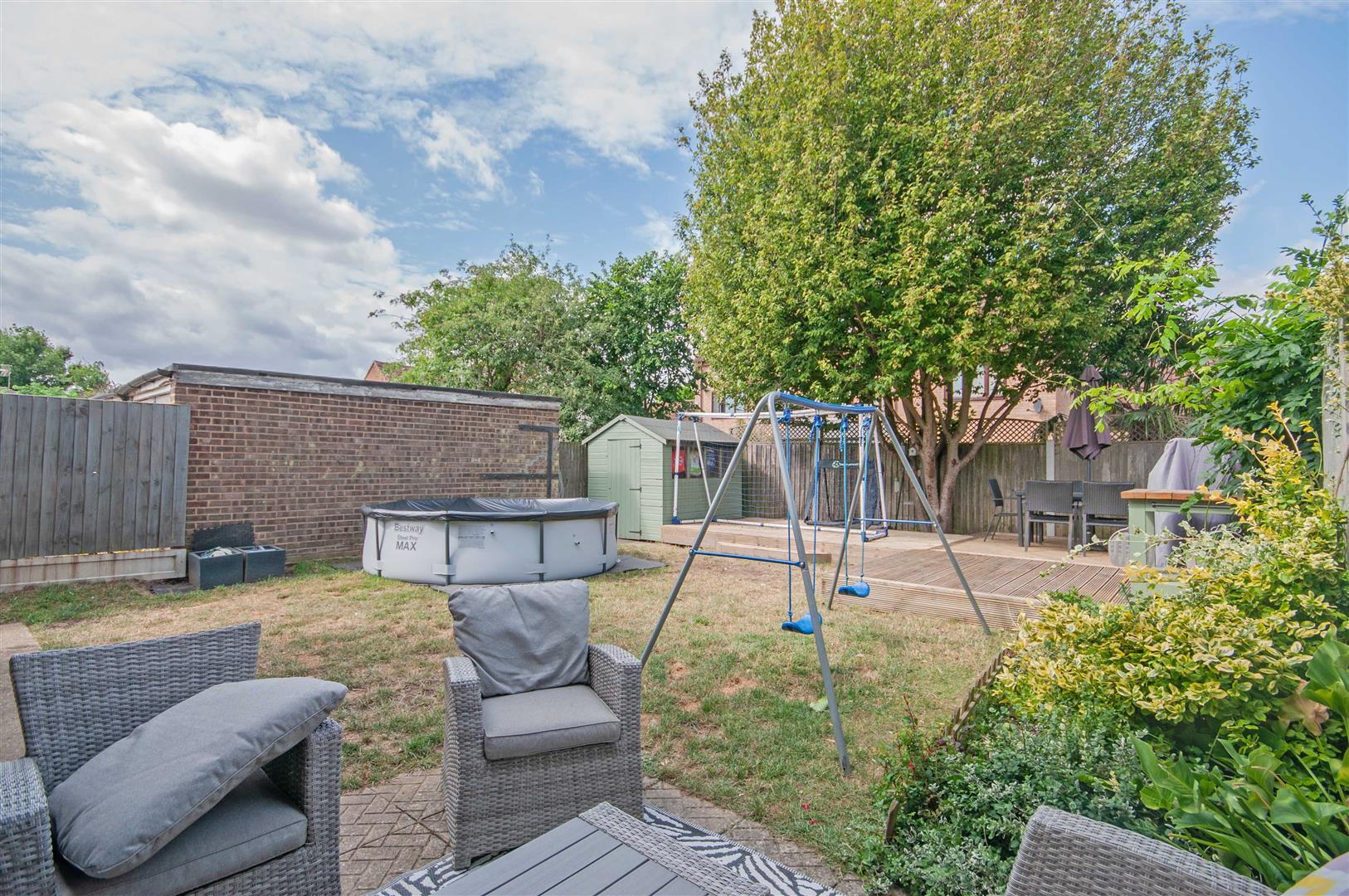 Rear Garden: - Patio to immediate rear, decking area to rear, gated side access, door to shed, mature shrubs, rest laid to lawn.