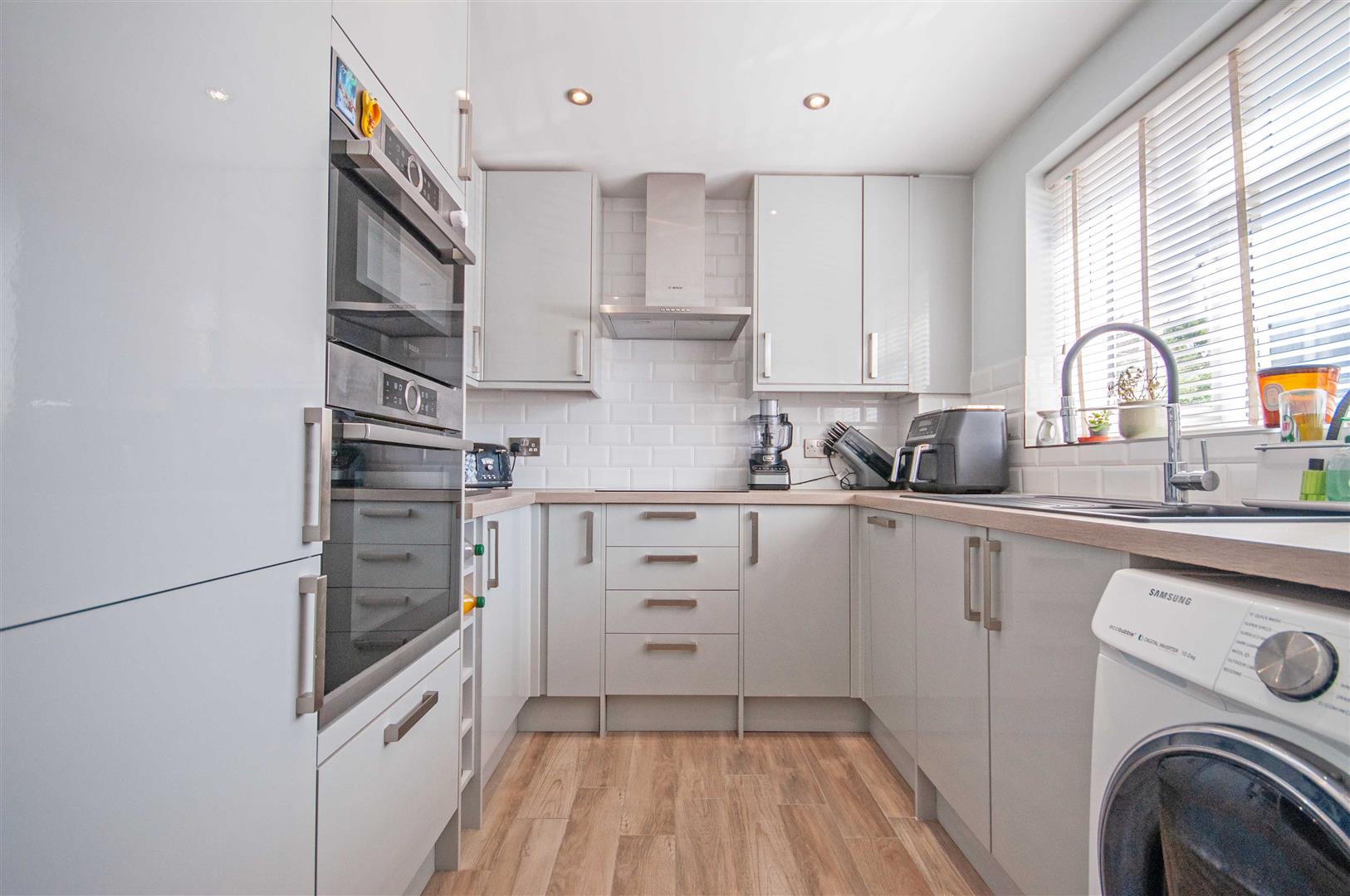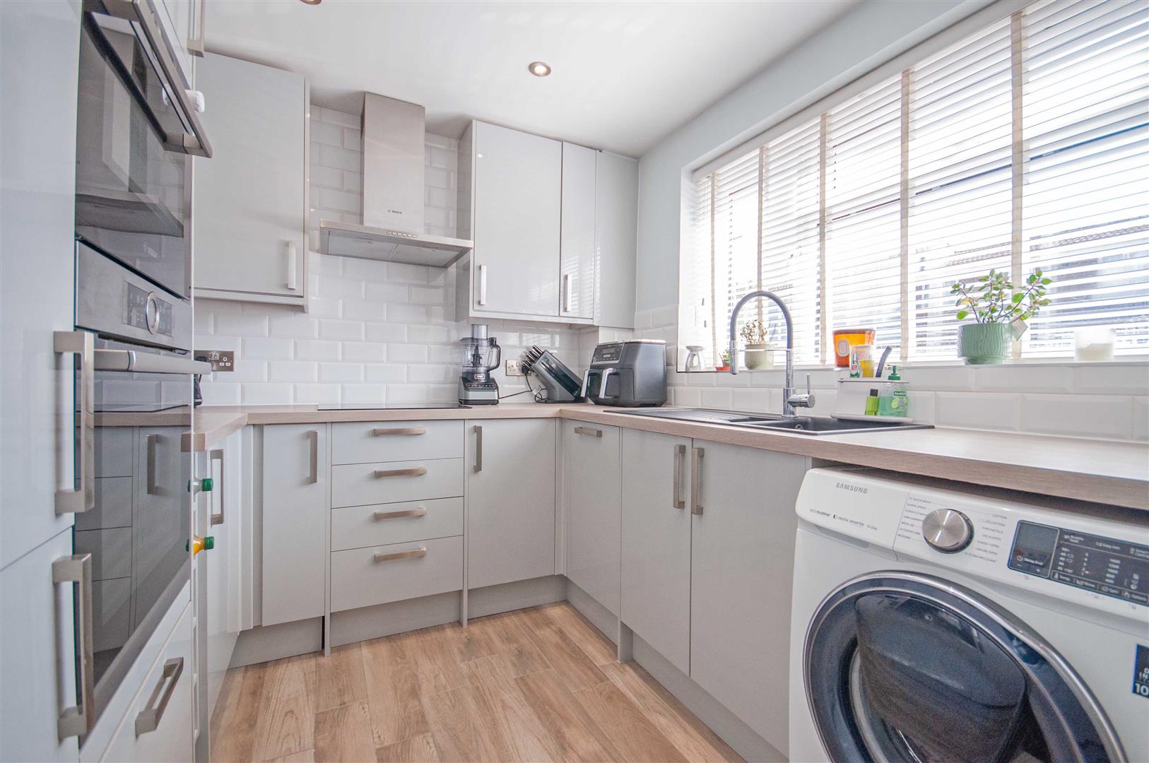 Kitchen: - 2.54m x 2.44m (8'4" x 8') - Double glazed window to front, range of wall and base units, square edge work surfaces with sink inset, integrated double oven, induction hob with extractor over, fridge freezer, slimline dishwasher, space for washing machine, part tiled walls, tiled flooring.