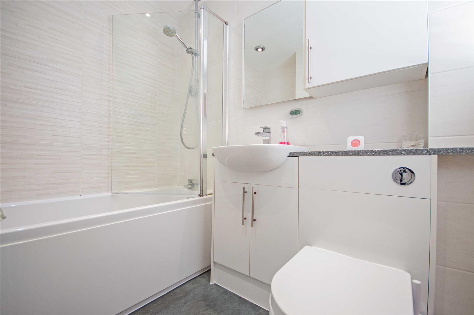 Family Bathroom: - 2.21m x 1.70m (7'3" x 5'7") - Obscure double glazed window to front, panel bath with shower over, vanity hand wash basin, low level W/C, chrome towel radiator, tiled walls.