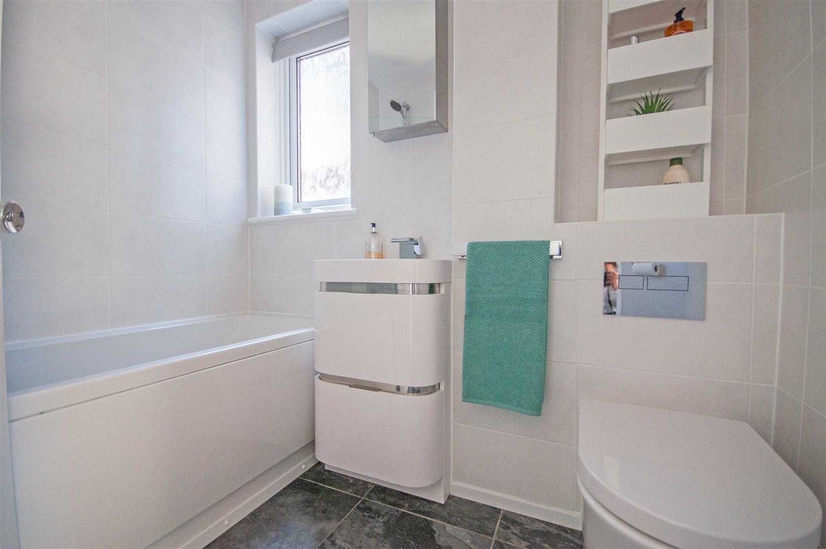 Bathroom: - 2.11m x 1.68m (6'11" x 5'6") - Obscure double glazed window to side, panel bath with shower over, vanity hand wash basin, low level W/C, chrome towel radiator, tiled walls and flooring.