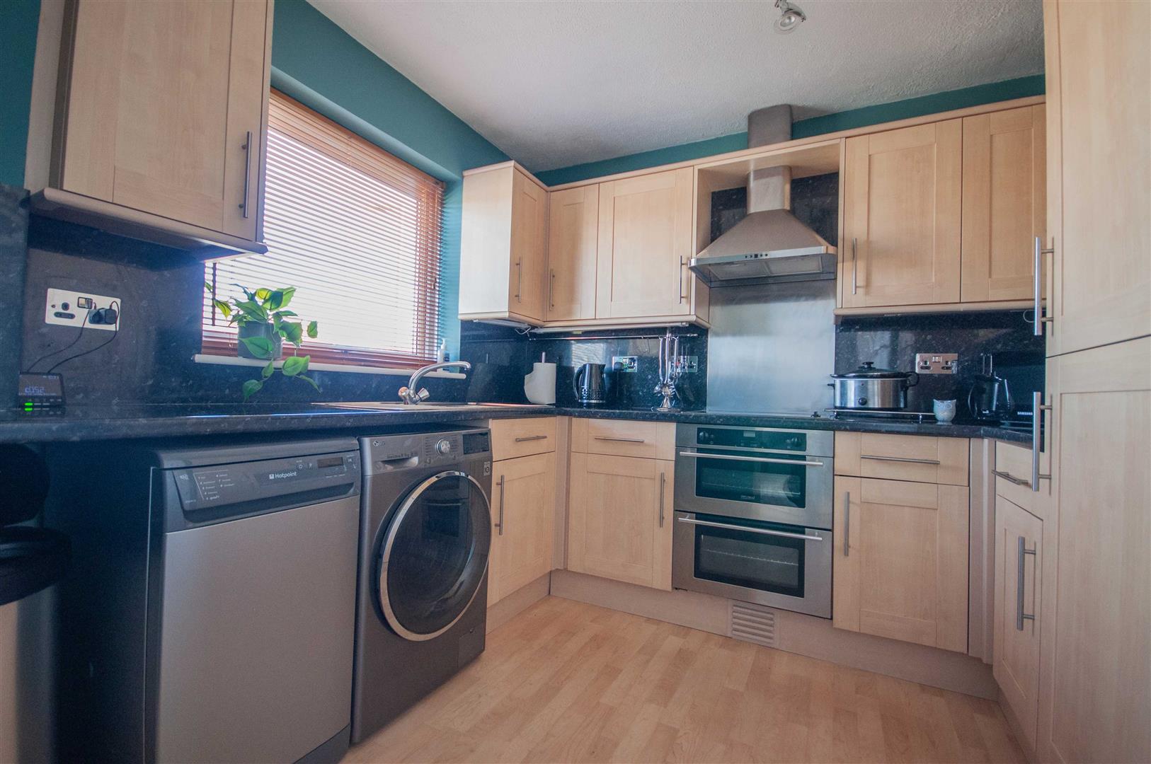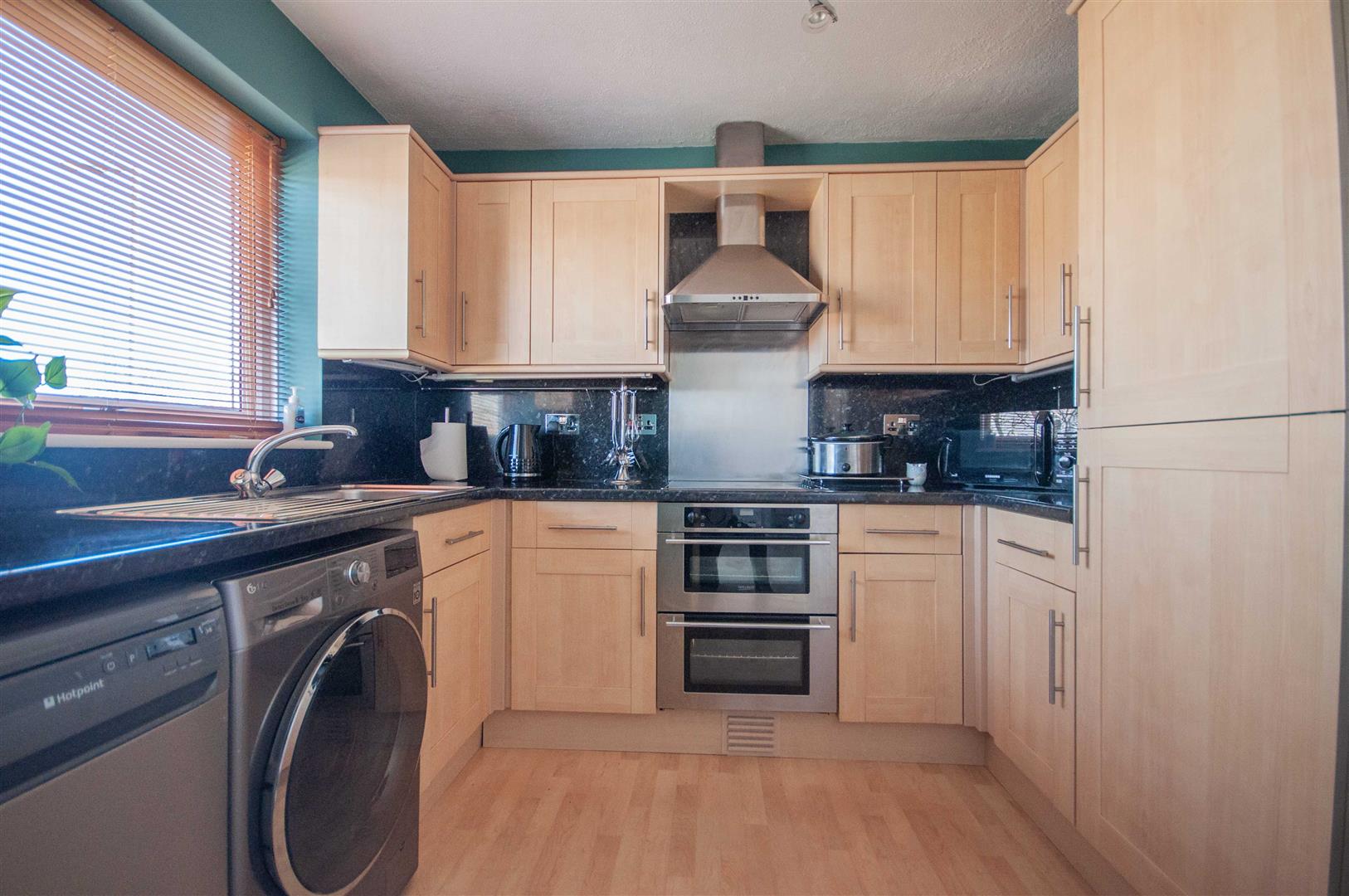 Kitchen: - 2.77m x 2.59m (9'1" x 8'6") - Double glazed window to rear, range of wall and base units, rolled edge work surfaces with stainless steel sink inset, integrated low level double oven, electric hob with stainless steel splash back and extractor over, fridge freezer, space for washing machine, dishwasher, cupboard.