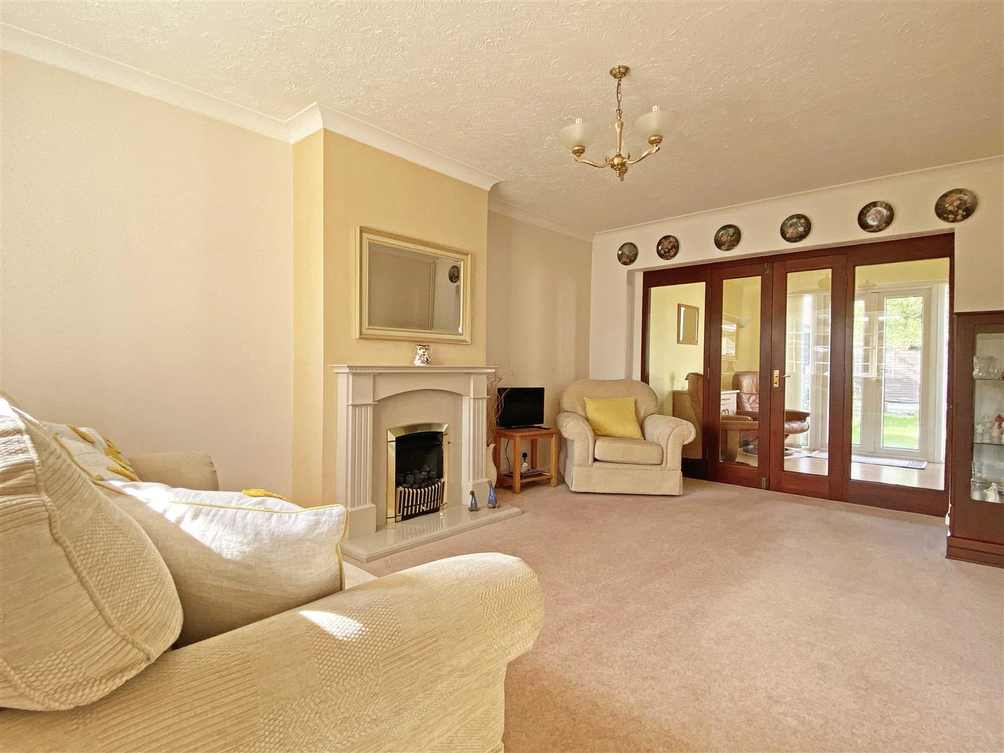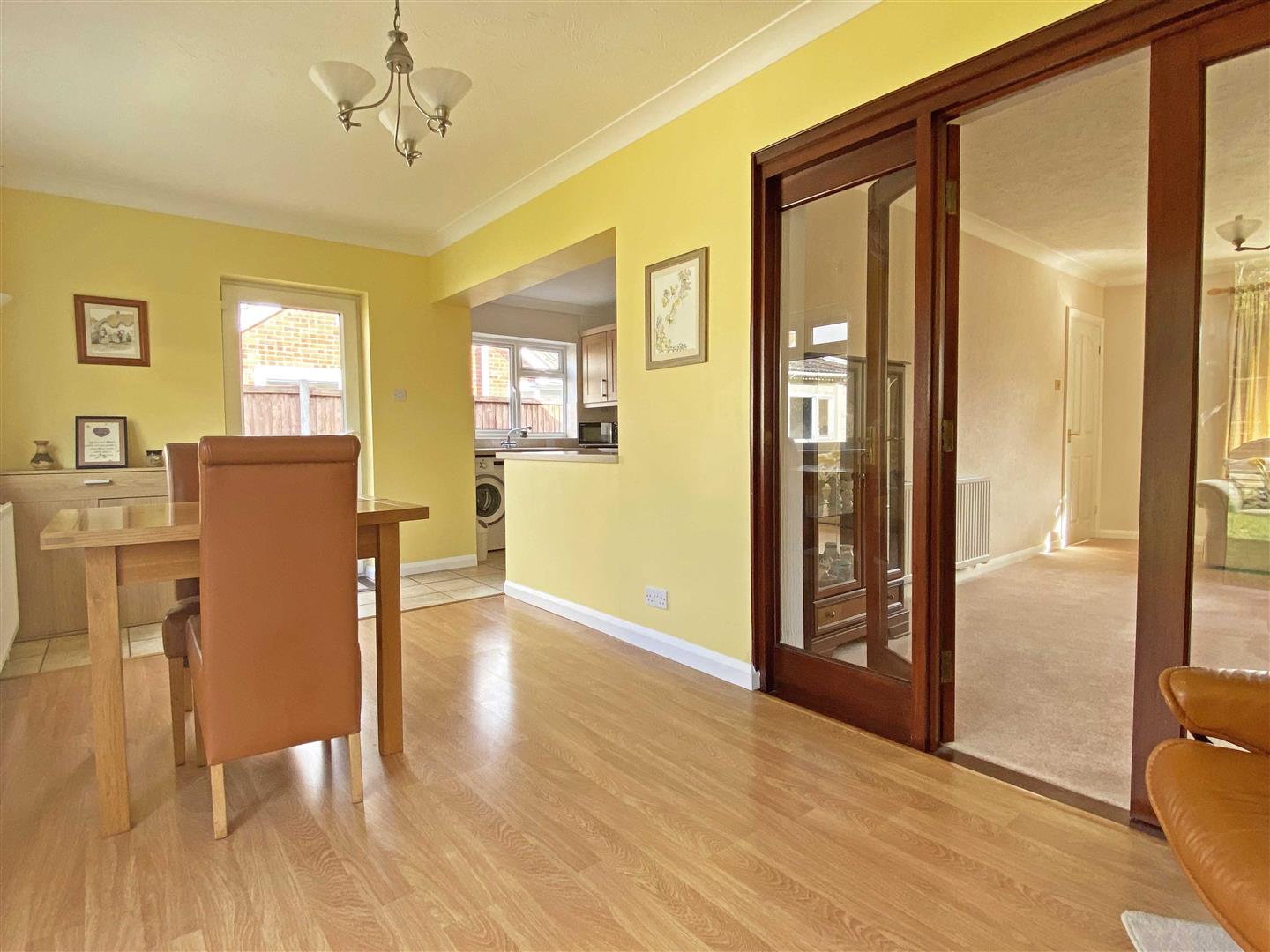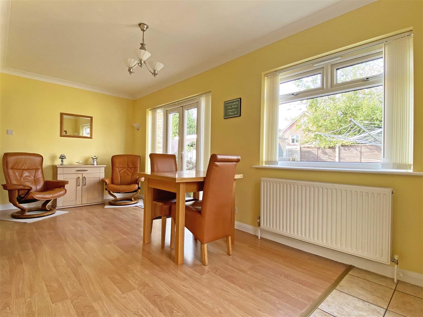 Dining Room: - 5.66m x 2.44m (18'7" x 8') - Double glazed window and french doors to rear, door to side, double doors to lounge, radiator, wood effect flooring.
