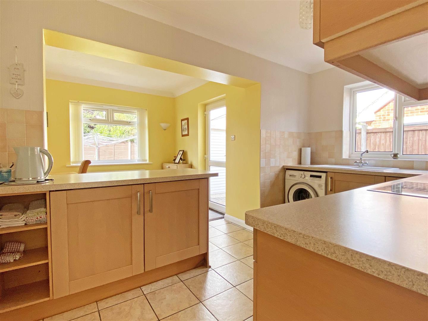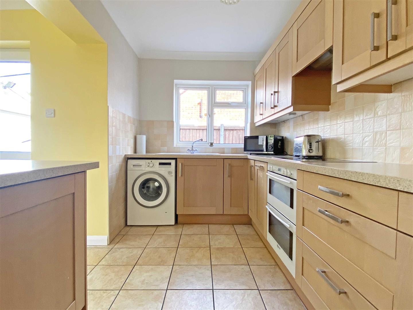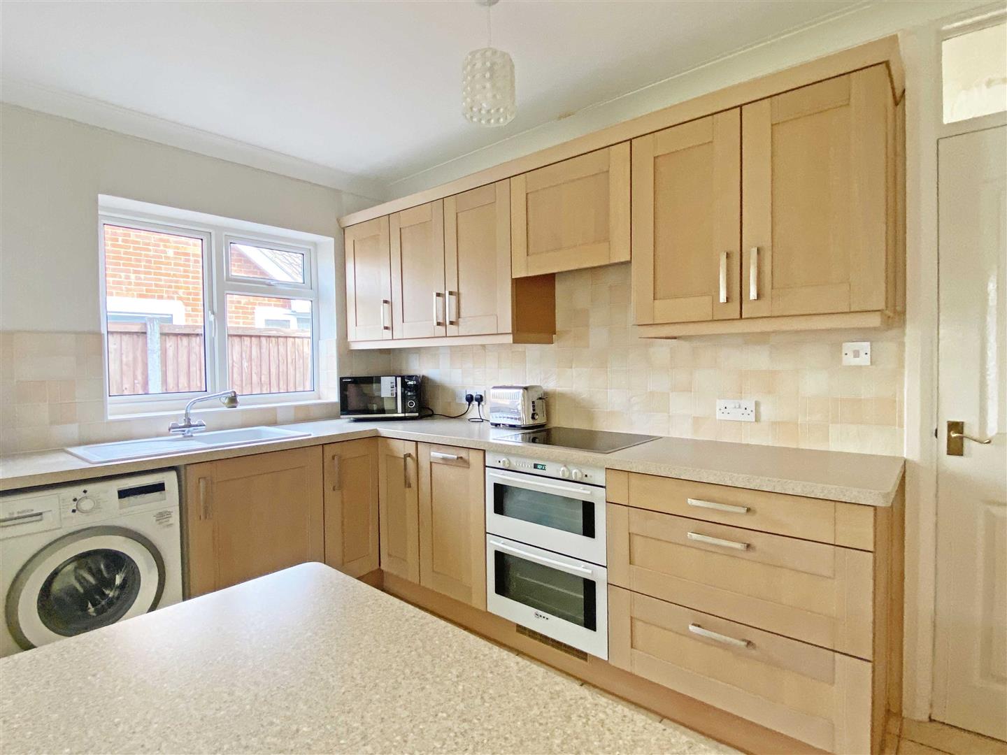 Kitchen: - 3.73m x 2.41m (12'3" x 7'11") - Double glazed window to side, range of wall and base units, square edge work surfaces with sink inset, integrated low level double oven, wlwctric hob with extractor over, fridge freezer, dishwasher, space for washing machine, radiator, part tiled wlals, tiled flooring, open to:-