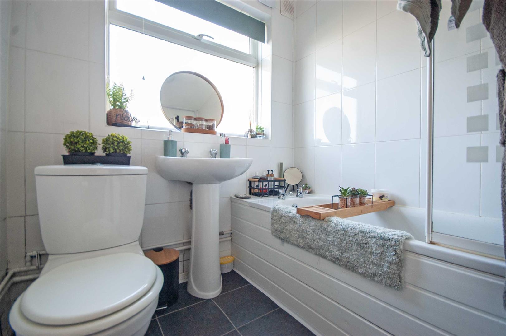 Bathroom: - 1.96m x 1.85m (6'5" x 6'1") - Obscure double glazed window to rear, panel bath with shower over, pedestal hand wash basin, low level W/C, tiled walls and flooring.