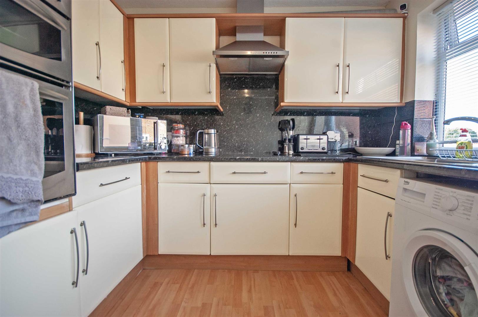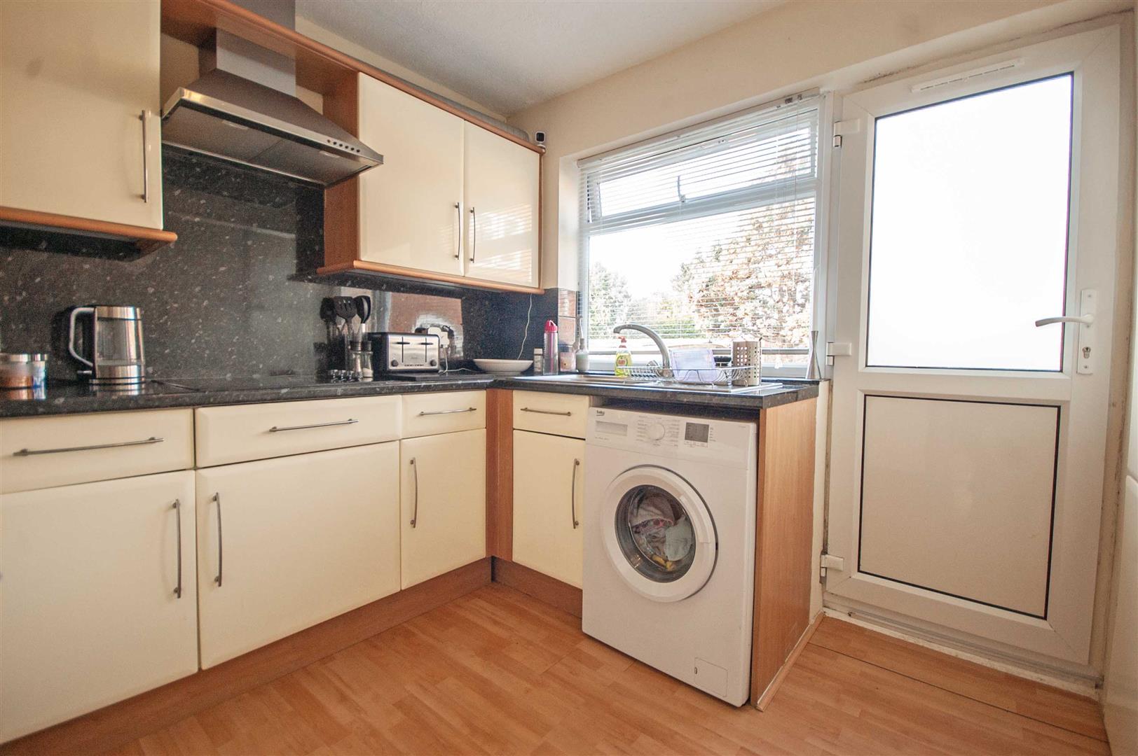 Kitchen: - 2.74m x 2.49m (9' x 8'2") - Double glazed window and door to rear, range of wall and base units, rolled edge work surfaces with stainless steel sink inset, integrated double oven, hob with extractor over, space for washing machine, cupboard, wood effect flooring.