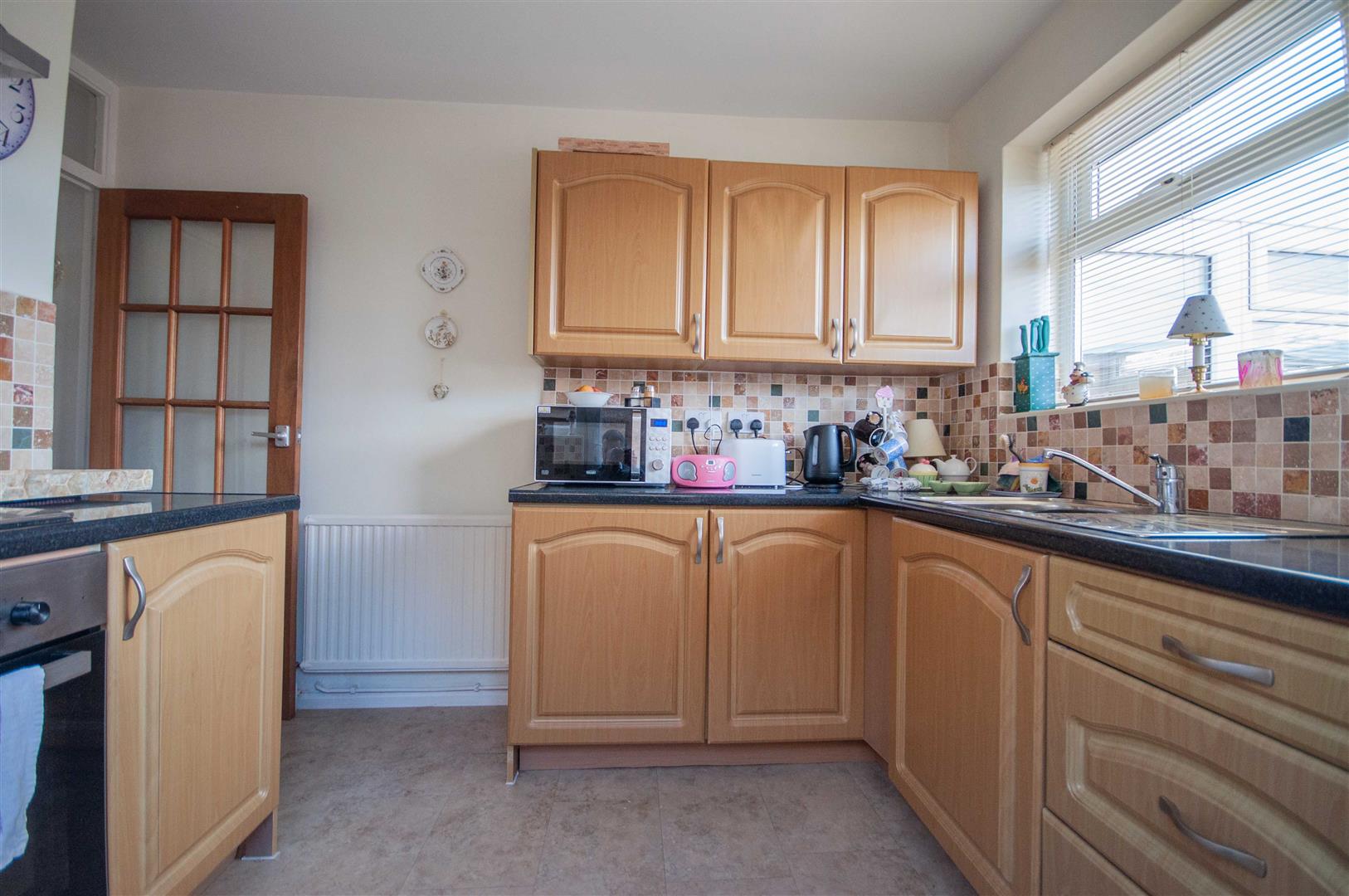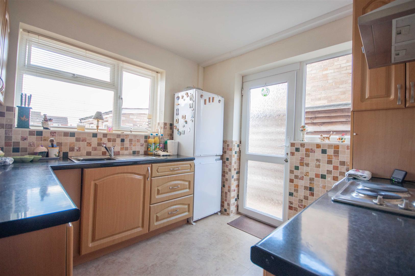 Kitchen: - 3.30m > 2.77m x 2.69m (10'10" > 9'1" x 8'10") - Double glazed window to rear, UPVC door and window to side, range of wall and base units, rolled edge work surfaces with stainless steel sink inset, integrated low level oven, electric hob with extractor over, space for washing machine, fridge freezer, boiler to cupboard, radiator, part tiled walls.