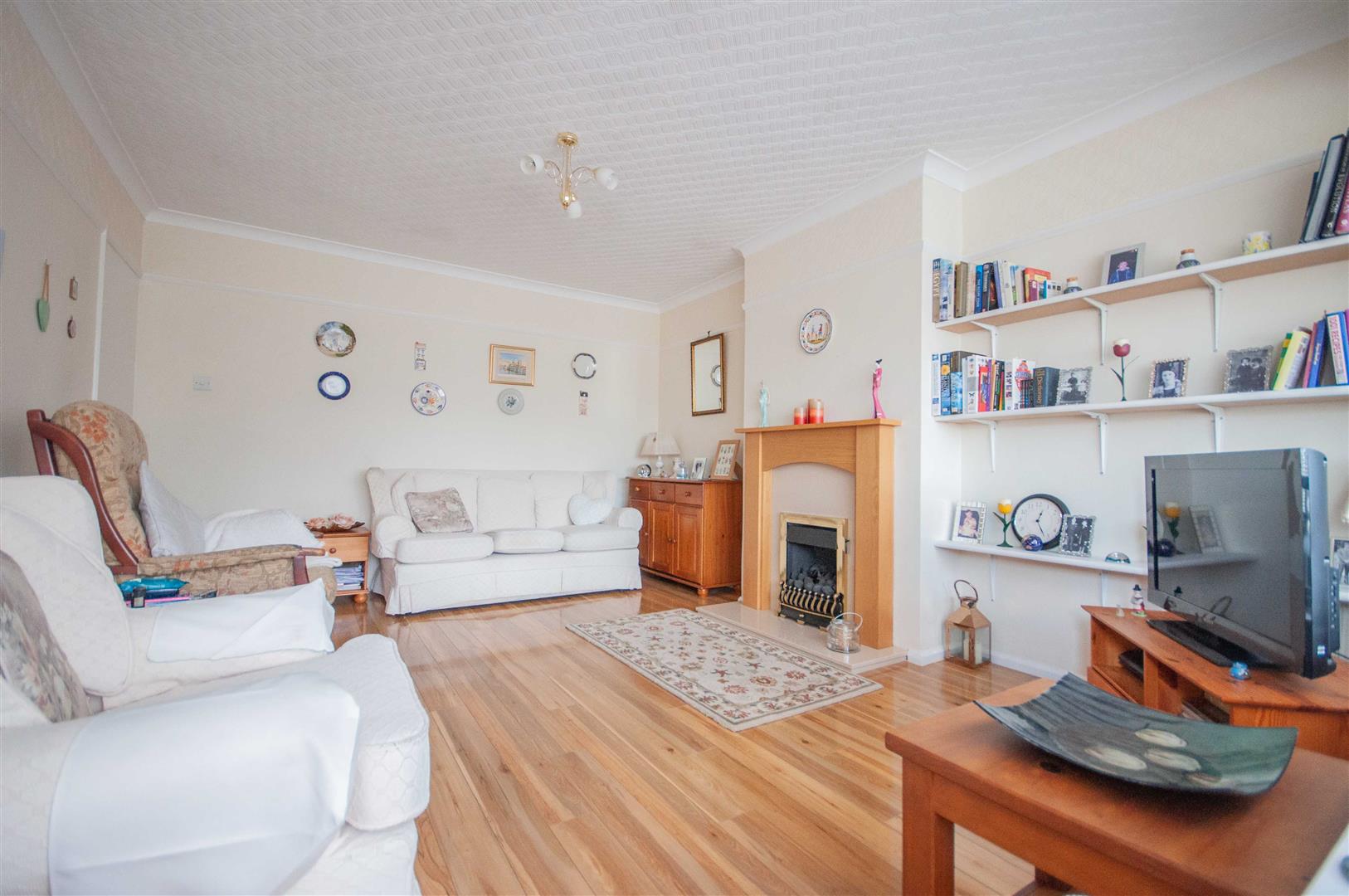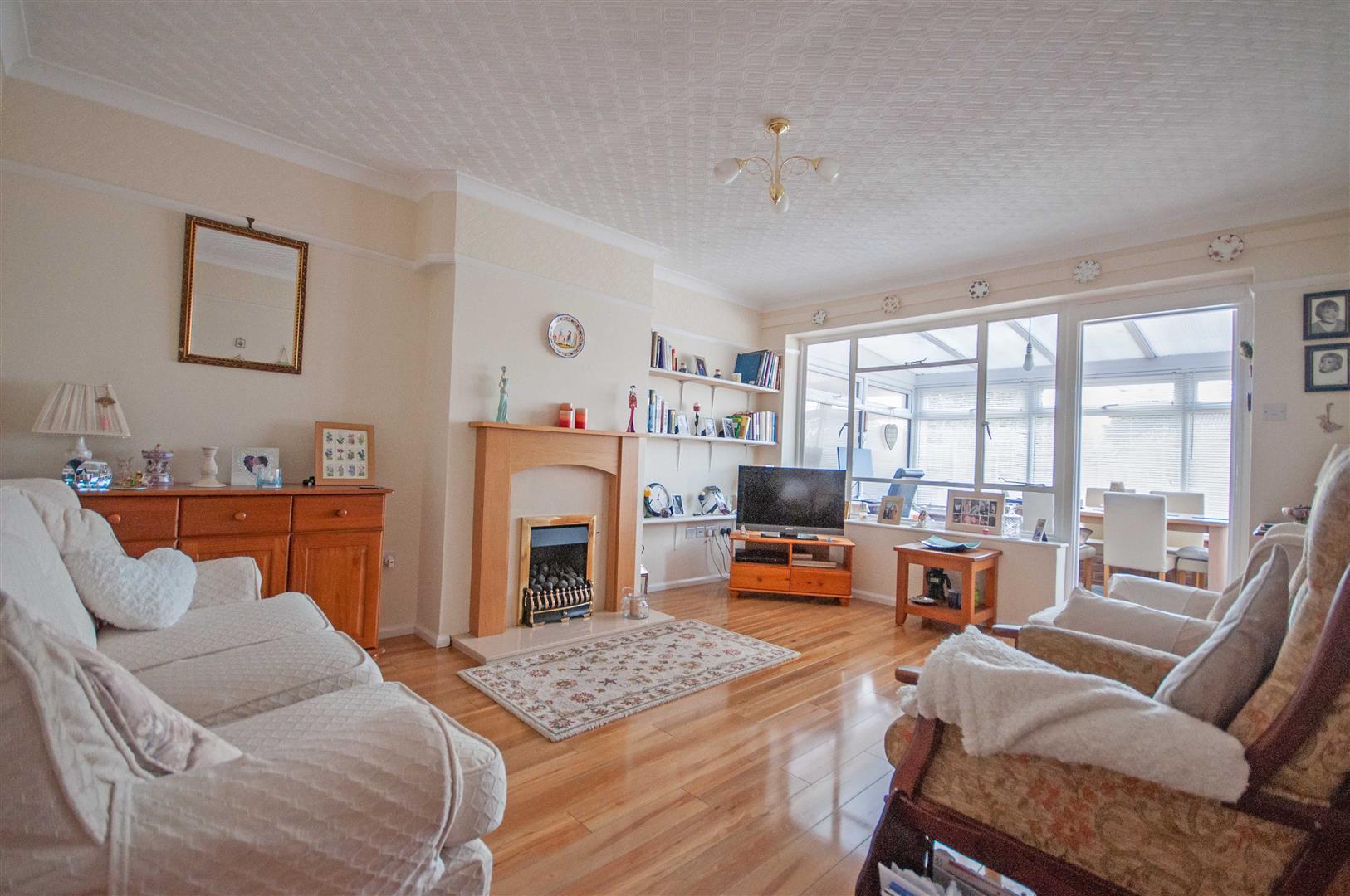 Lounge: - 4.57m x 3.66m (15' x 12') - Window and door to conservatory, fireplace, radiator, wood effect flooring.